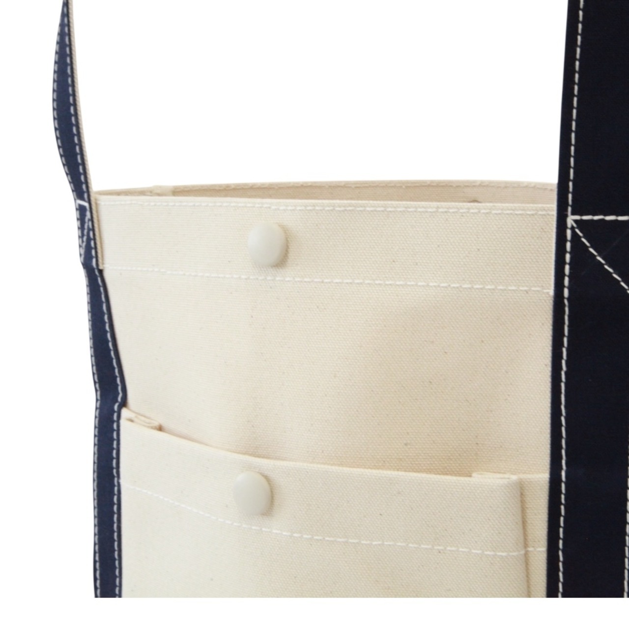 This tote bag features a vertical one-handle design, crafted using SEASAW’s exclusive original canvas. The outer pocket and opening are finished with elegant leather-covered buttons, showcasing attention to detail in every aspect.