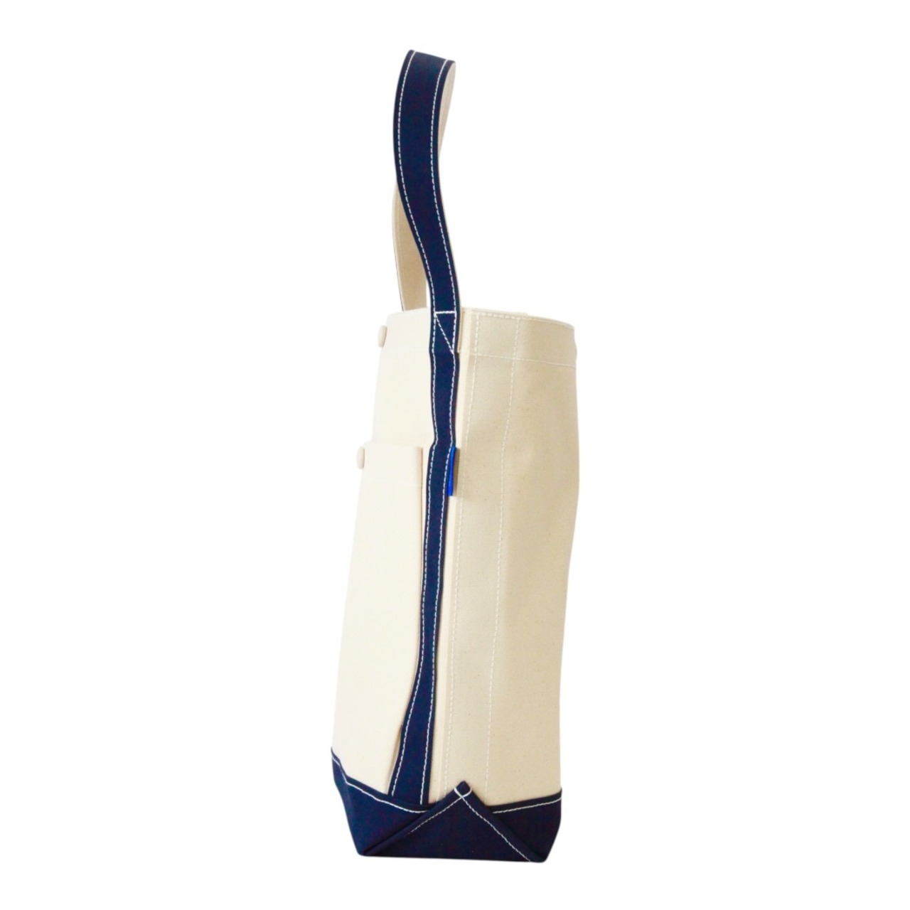 縫製には、バッグ本体の底から側面のマチにかけて三角形にステッチを入れる「サンカクマチ」と呼ばれる仕様を採用。これは、トートバッグの定番とも言える構造で、型崩れしにくく、美しいフォルムを保ちます。