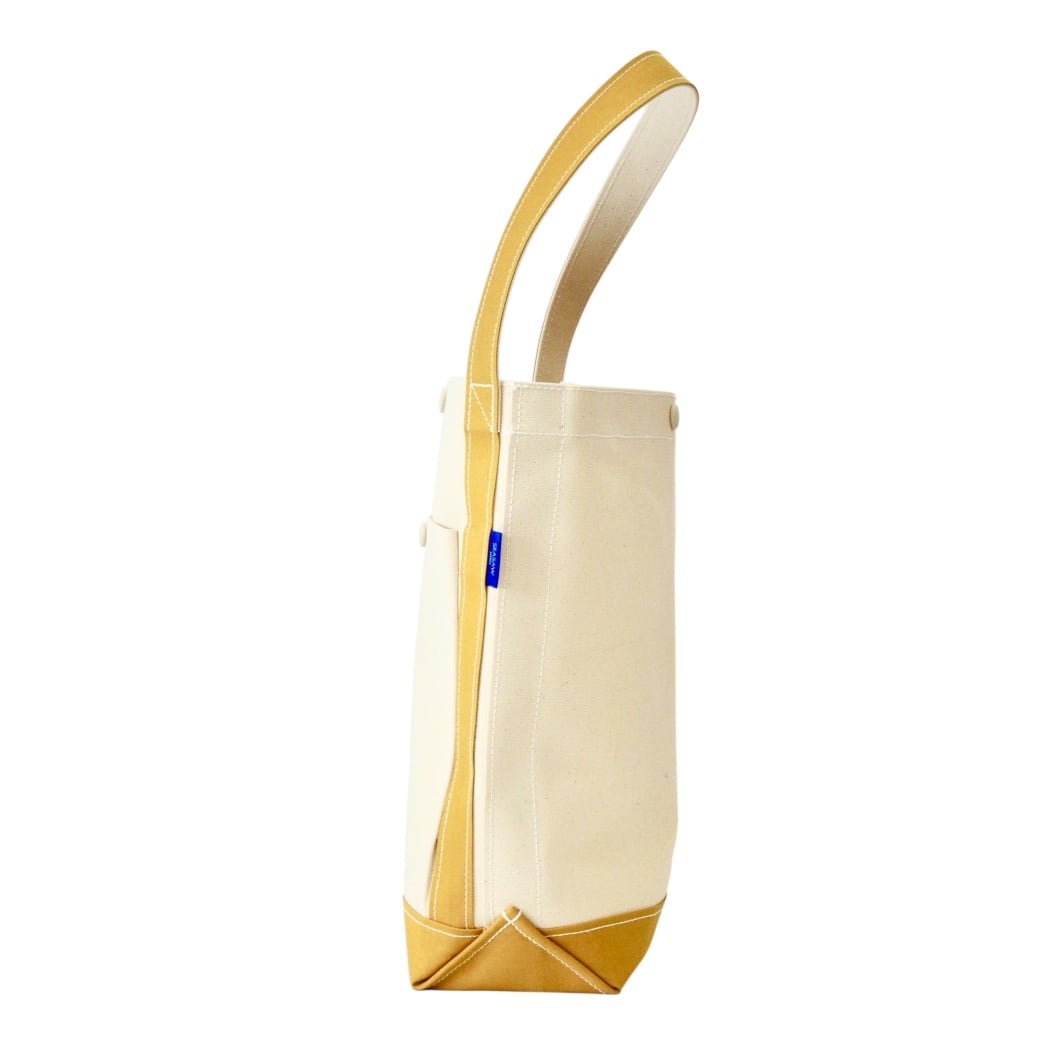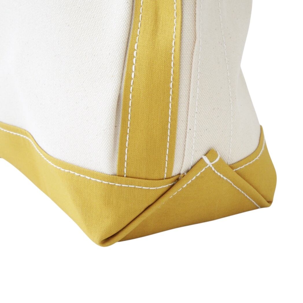 縫製には、バッグ本体の底から側面のマチにかけて三角形にステッチを入れる「サンカクマチ」と呼ばれる仕様を採用。これは、トートバッグの定番とも言える構造で、型崩れしにくく、美しいフォルムを保ちます。