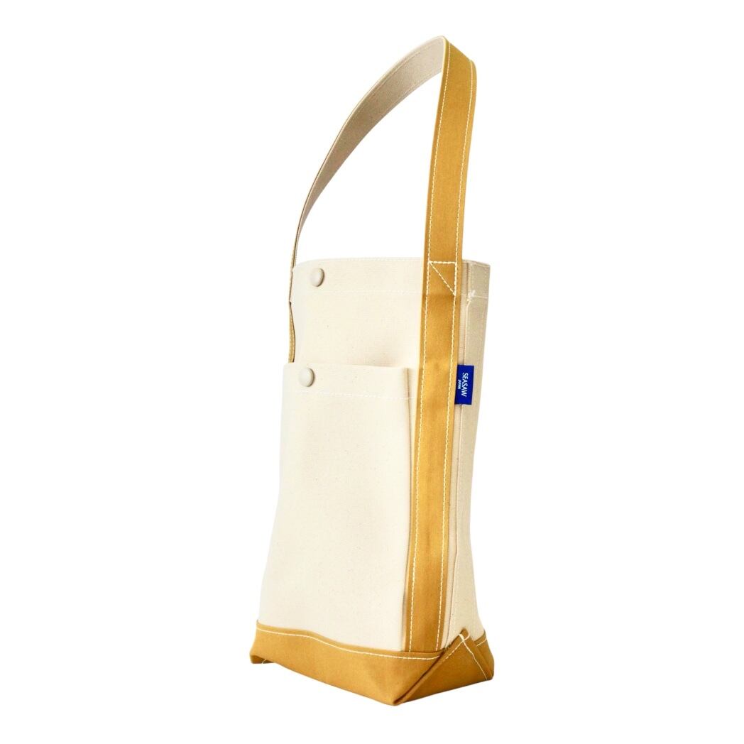 こちらのトートバッグは、SEASAWオリジナルの帆布を使用した、ワンハンドルの縦型デザインが特徴のアイテムです。外ポケットと開口部には、上品な革のくるみボタンを使用し、ディテールにもこだわりを詰め込みました。