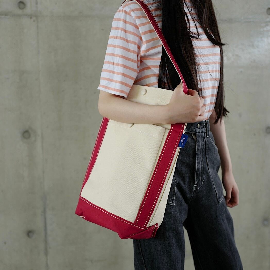 This tote bag features a vertical one-handle design, crafted using SEASAW’s exclusive original canvas. The outer pocket and opening are finished with elegant leather-covered buttons, showcasing attention to detail in every aspect.