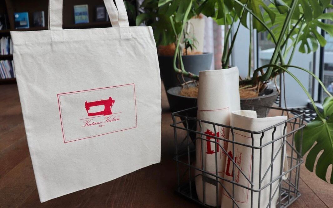 生成りに交野カバンの赤いロゴが可愛いエコバッグです。