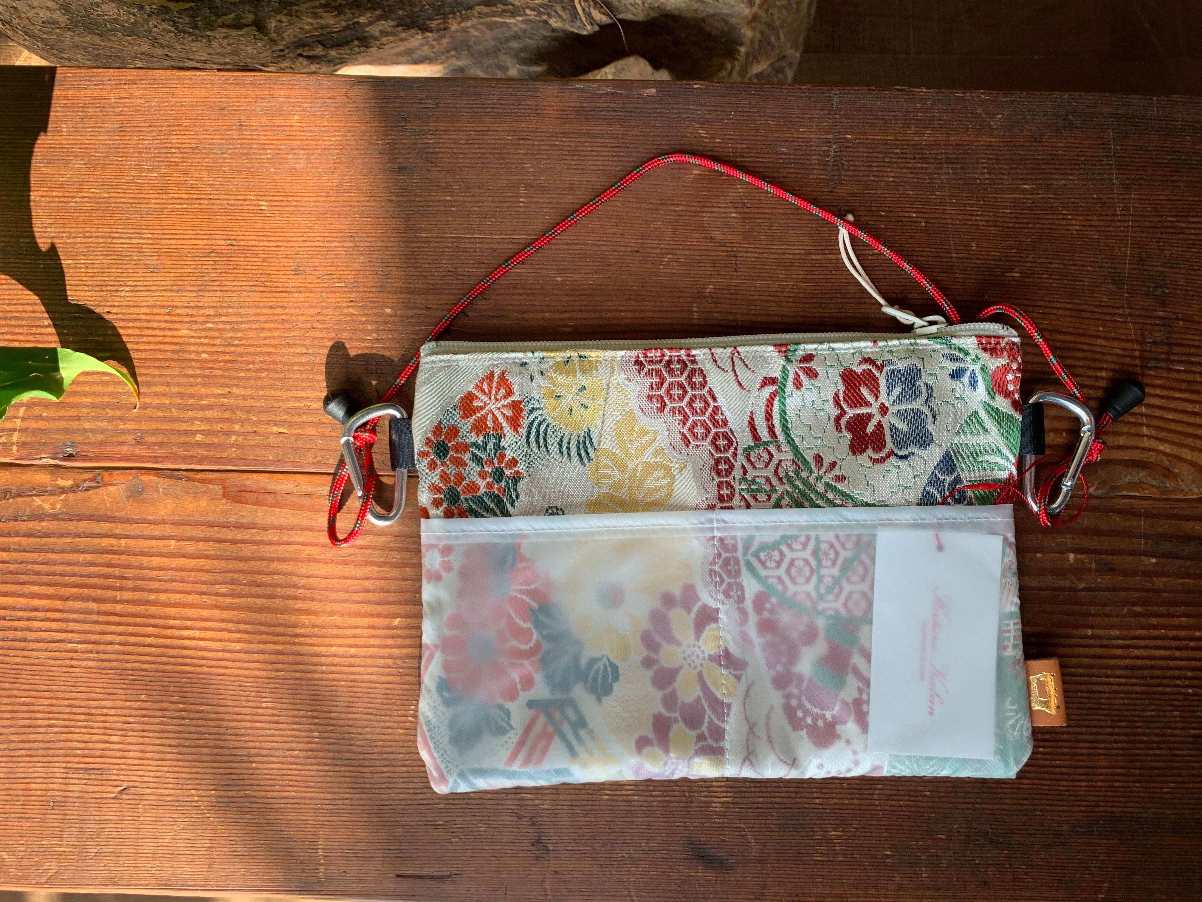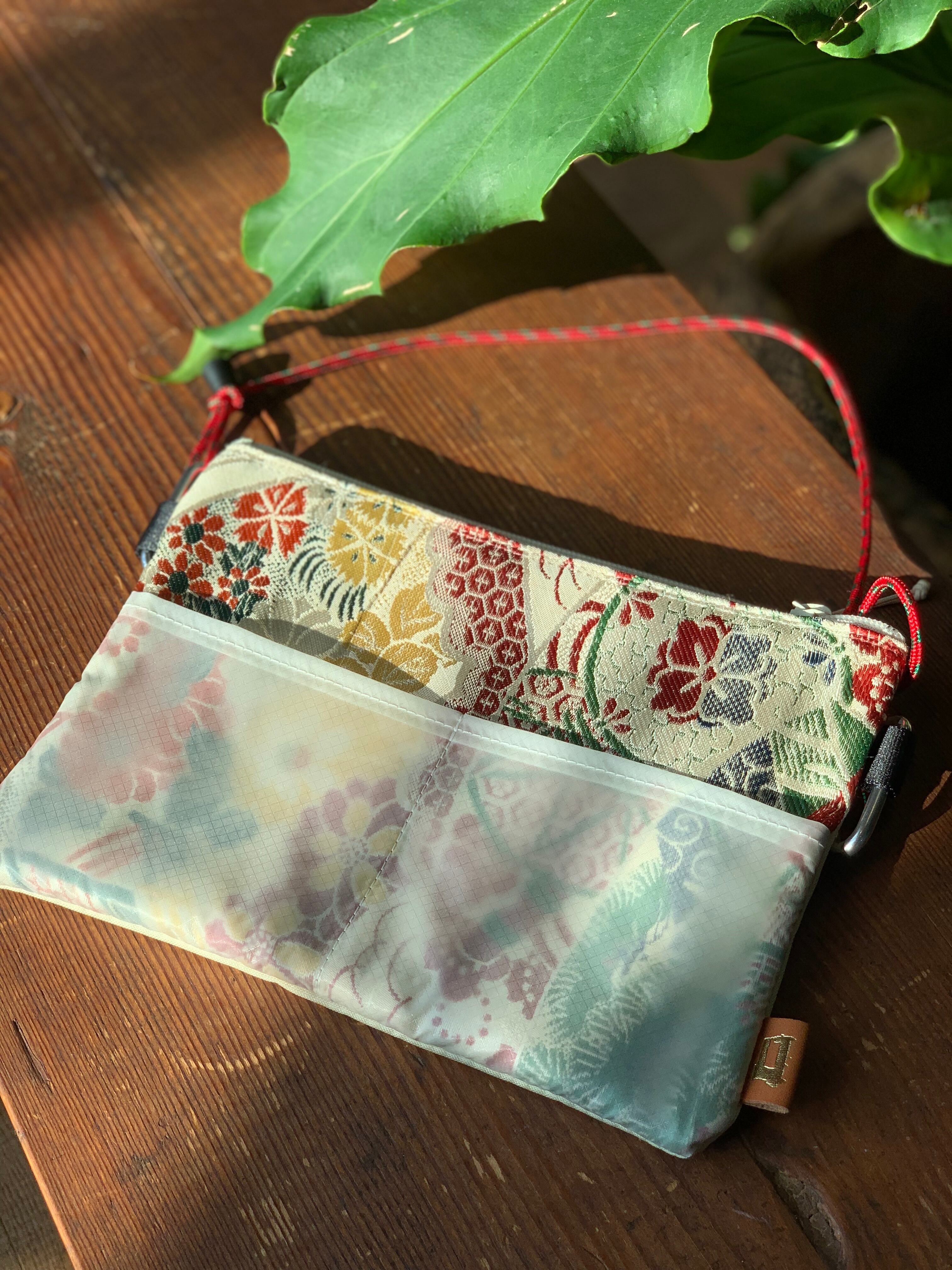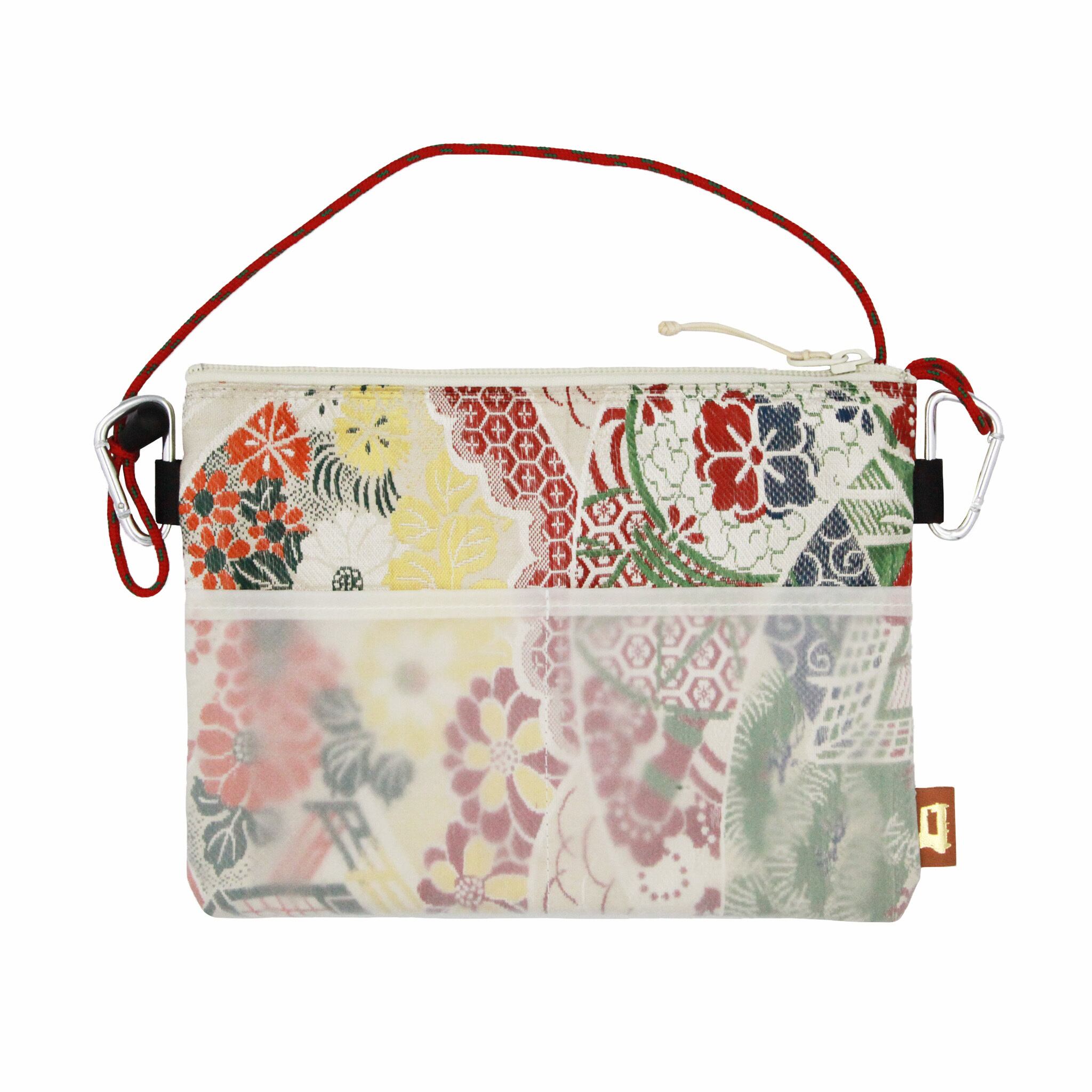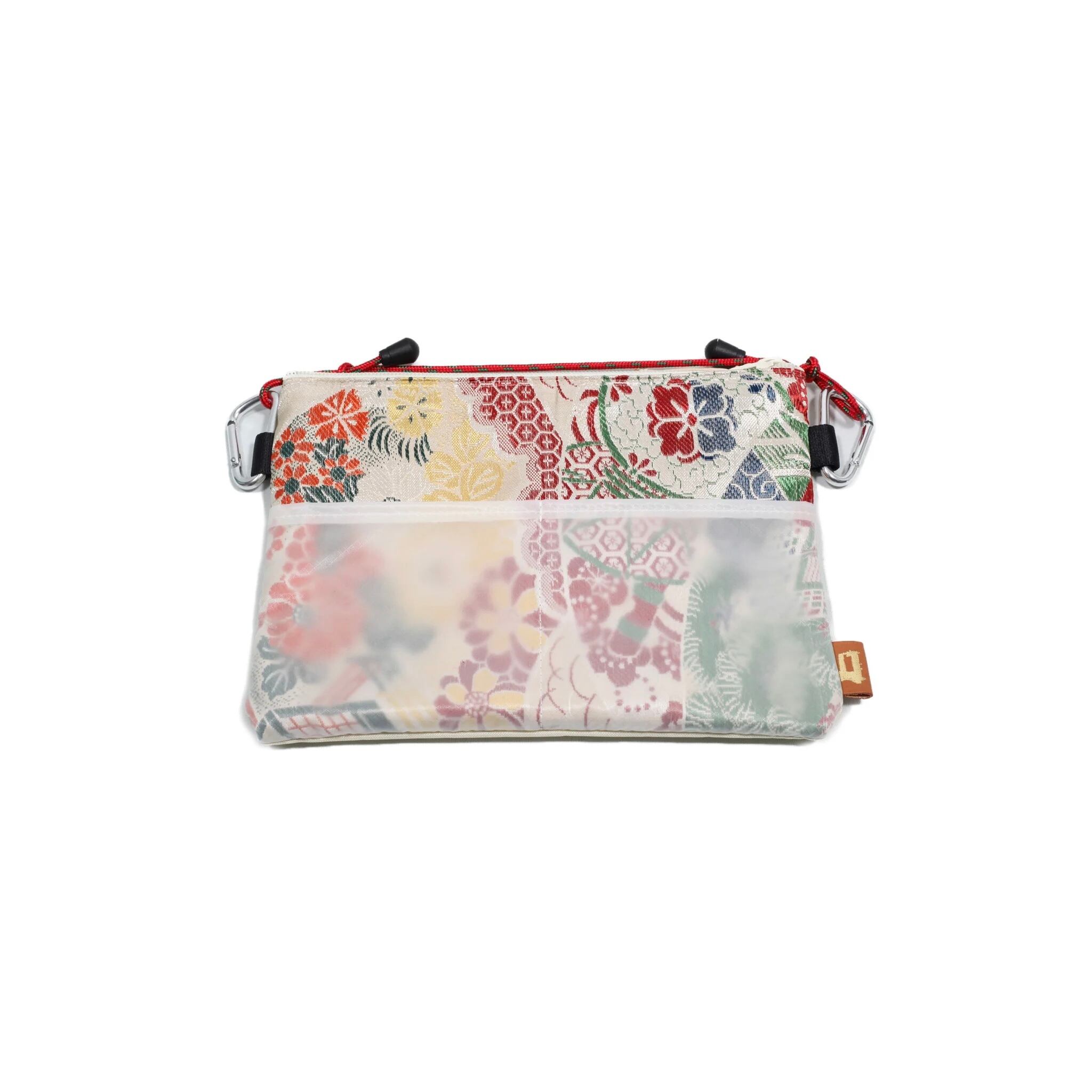 シルクの中古帯やアンティークの帯をデザイナーの感性で選び、現代的なアプローチでナイロン素材とミックスして制作したサコッシュバッグです。フロントに半透明なコーデュラナイロンをポケットとして配置し、シルク生地の保護の意味合いをデザインとしても活かしています。小ロット生産で、様々なテイストがミックスされたアソートの商品です。