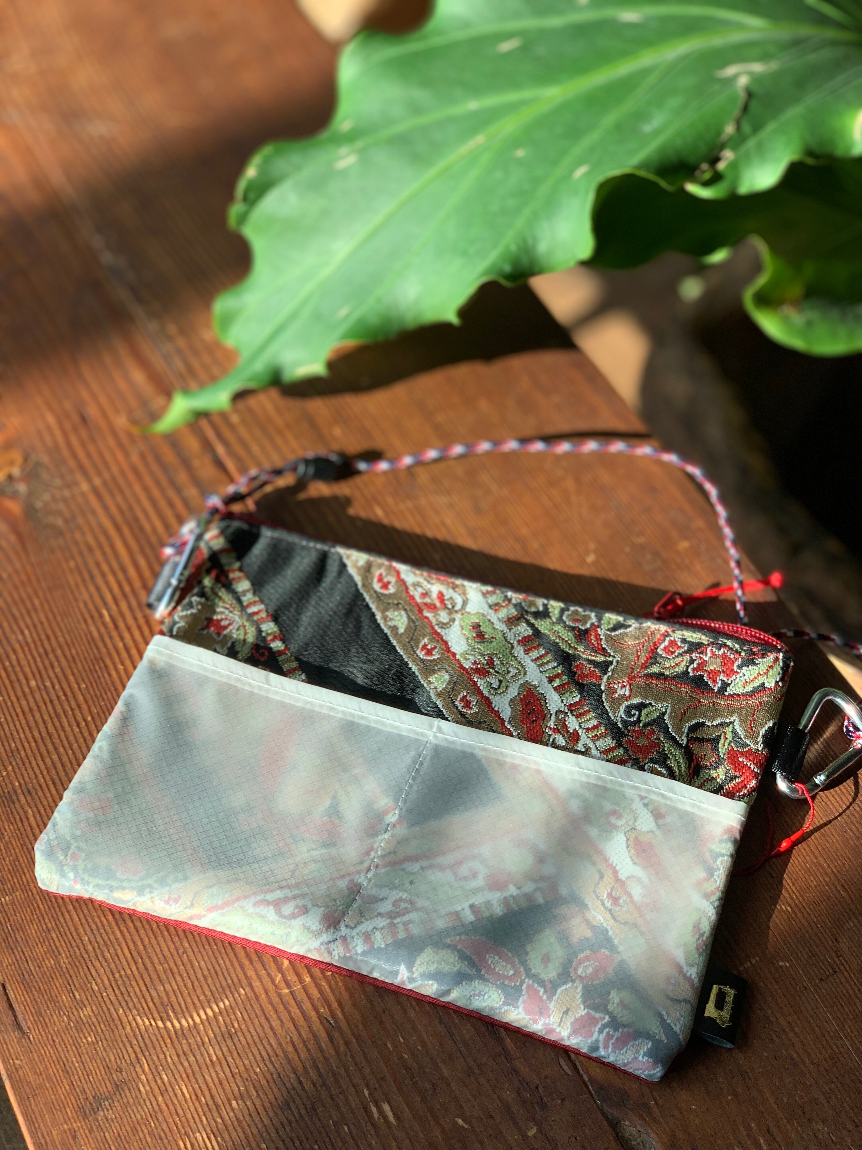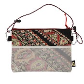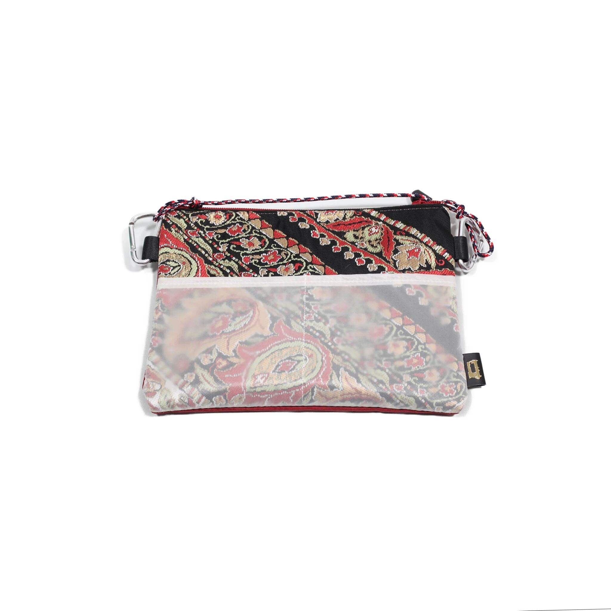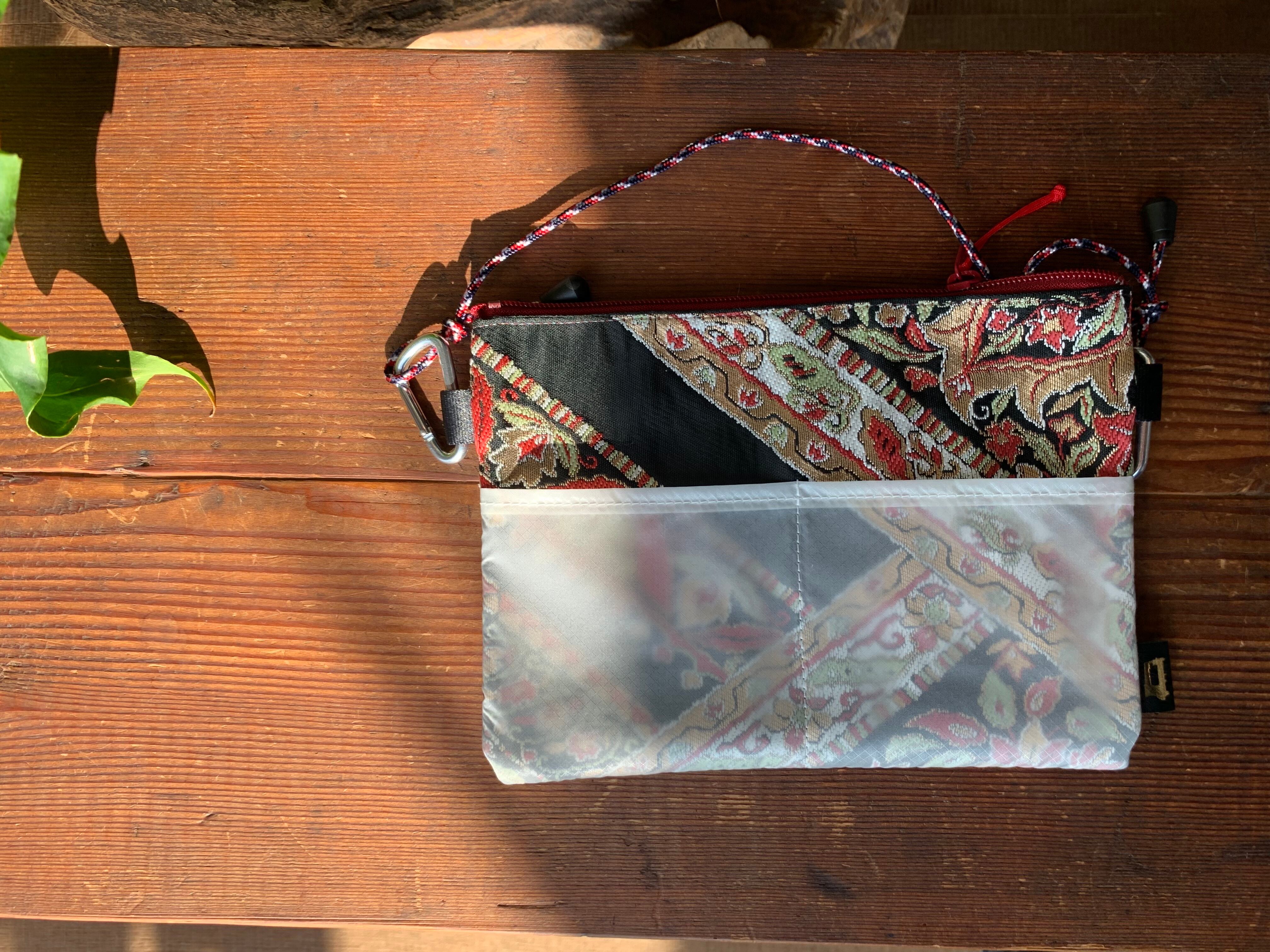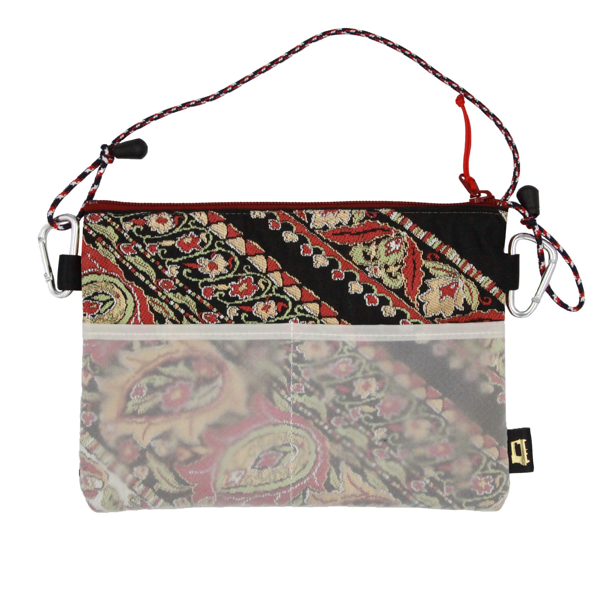 シルクの中古帯やアンティークの帯をデザイナーの感性で選び、現代的なアプローチでナイロン素材とミックスして制作したサコッシュバッグです。フロントに半透明なコーデュラナイロンをポケットとして配置し、シルク生地の保護の意味合いをデザインとしても活かしています。小ロット生産で、様々なテイストがミックスされたアソートの商品です。