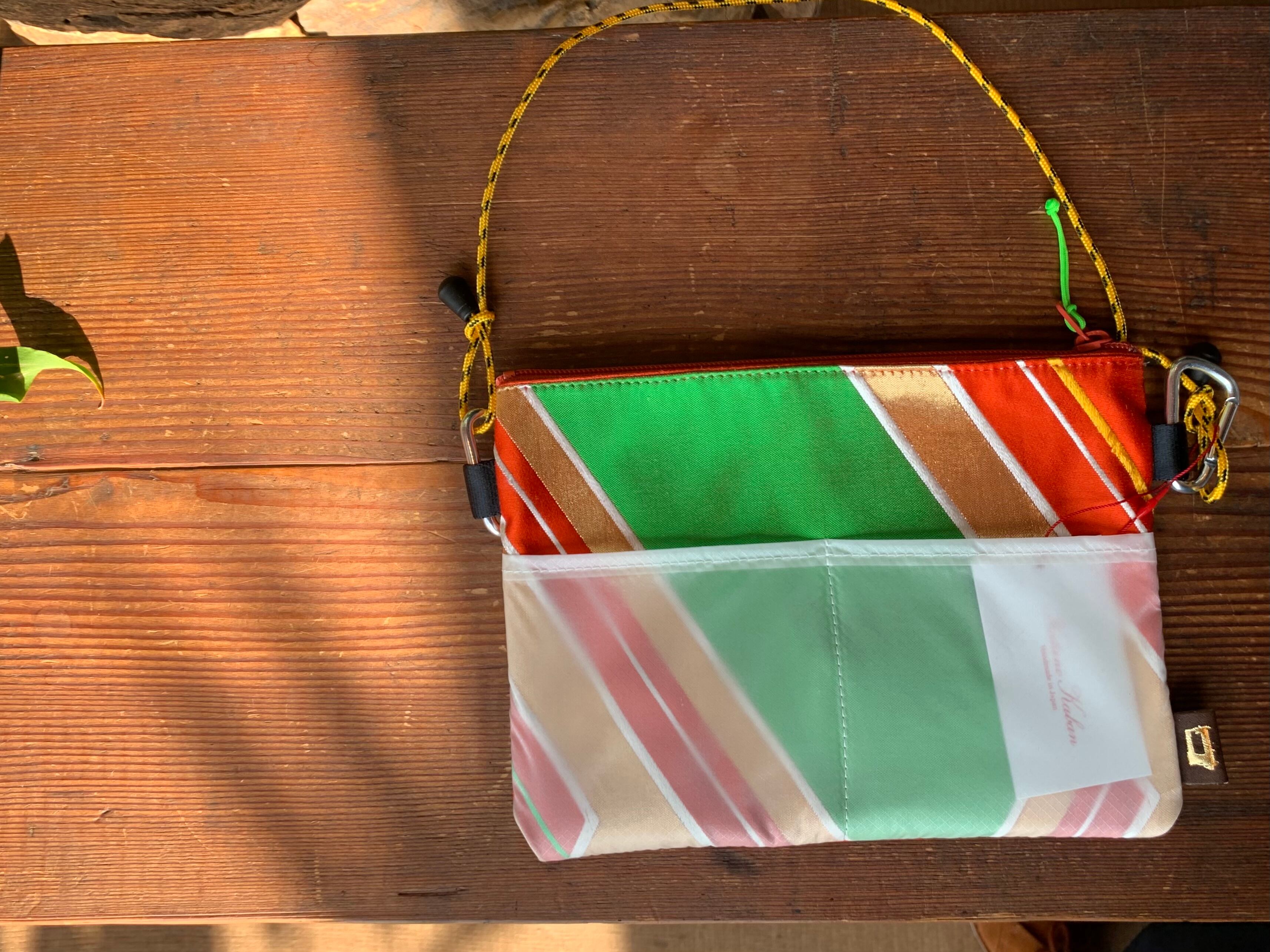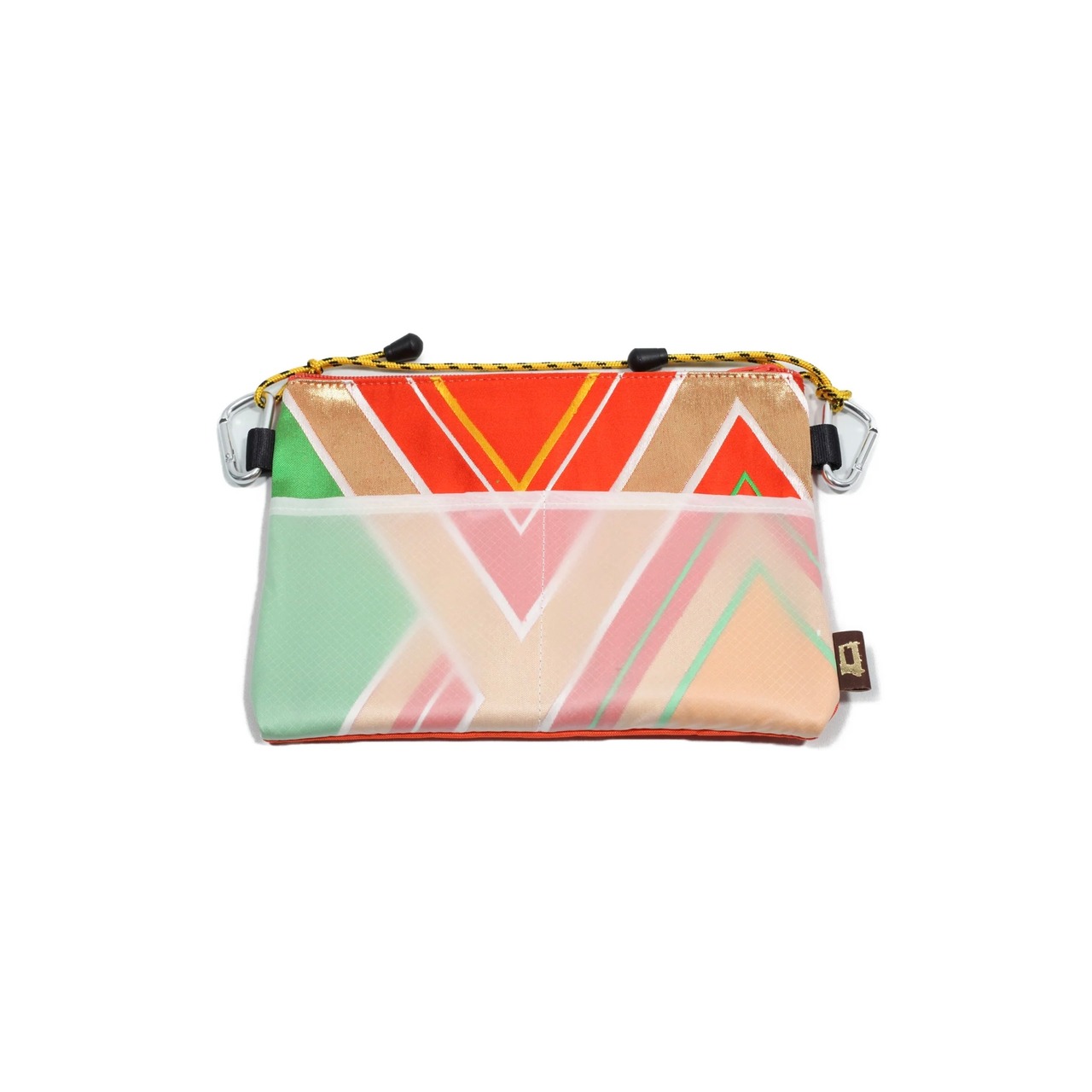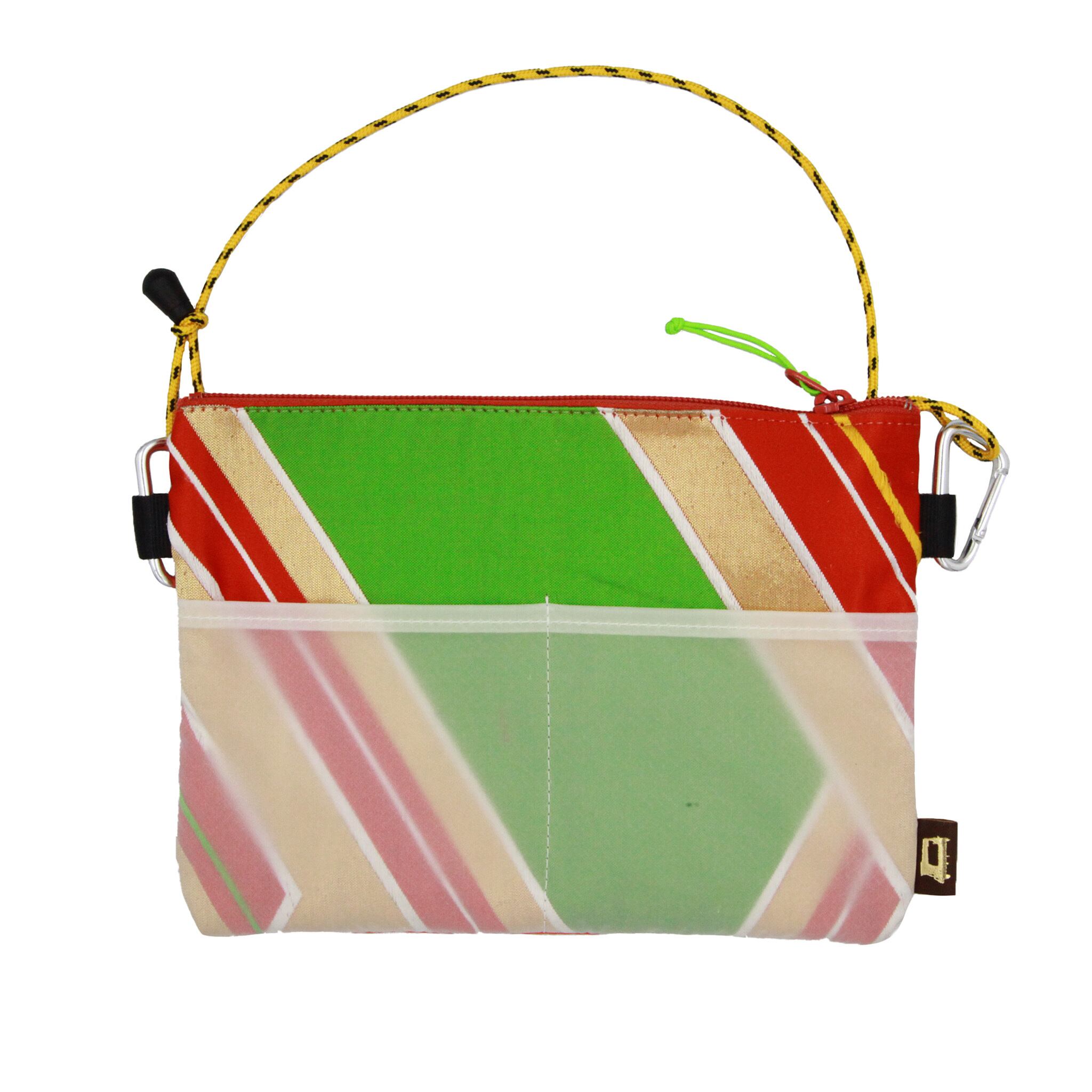 シルクの中古帯やアンティークの帯をデザイナーの感性で選び、現代的なアプローチでナイロン素材とミックスして制作したサコッシュバッグです。フロントに半透明なコーデュラナイロンをポケットとして配置し、シルク生地の保護の意味合いをデザインとしても活かしています。小ロット生産で、様々なテイストがミックスされたアソートの商品です。