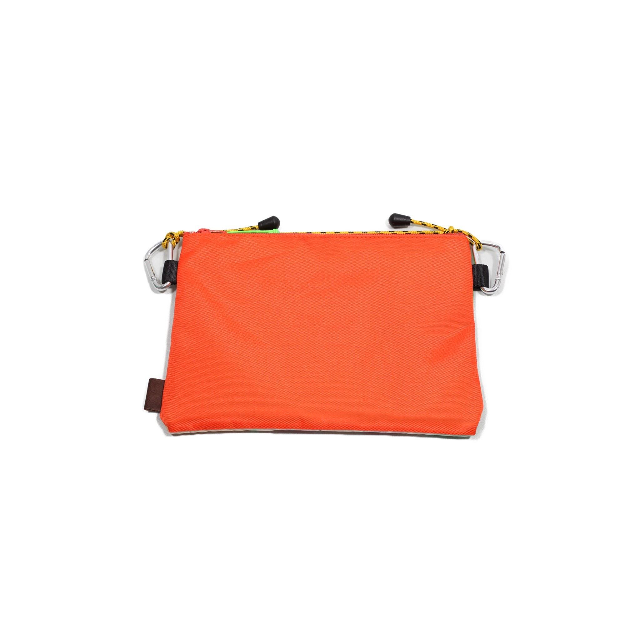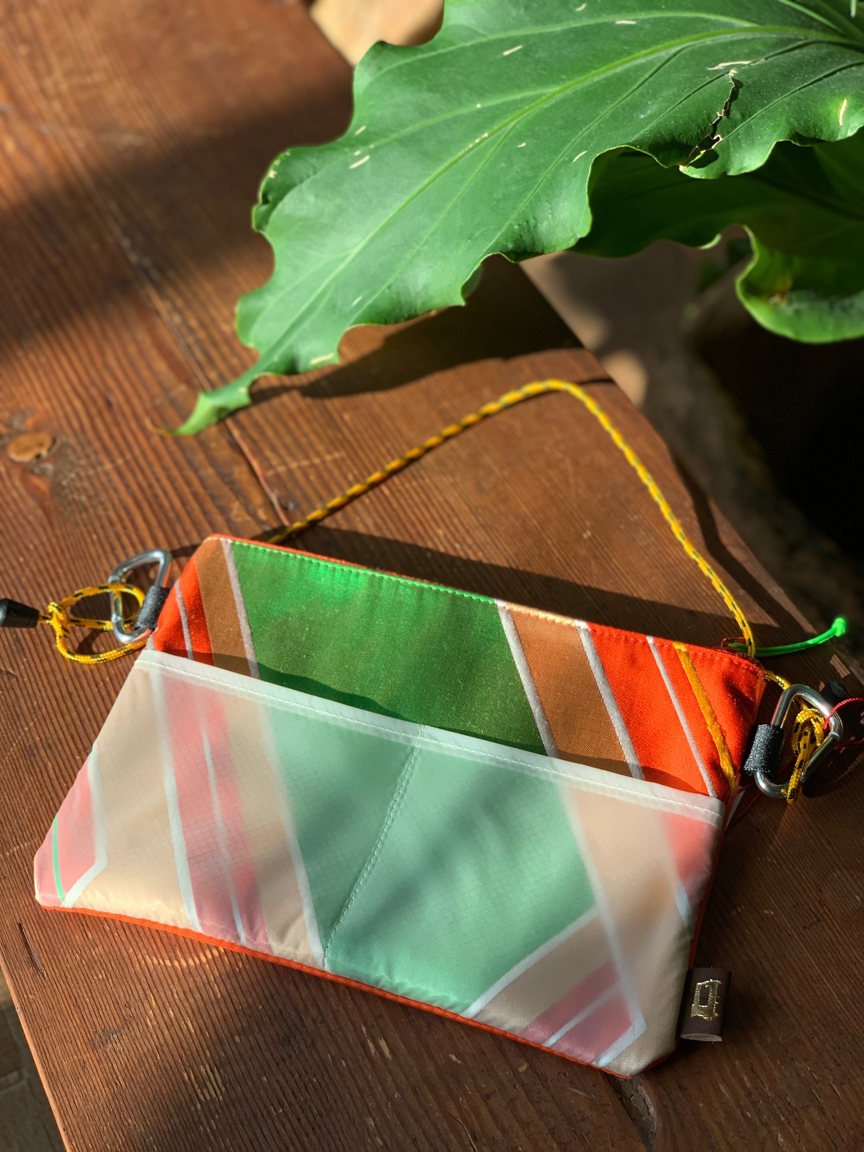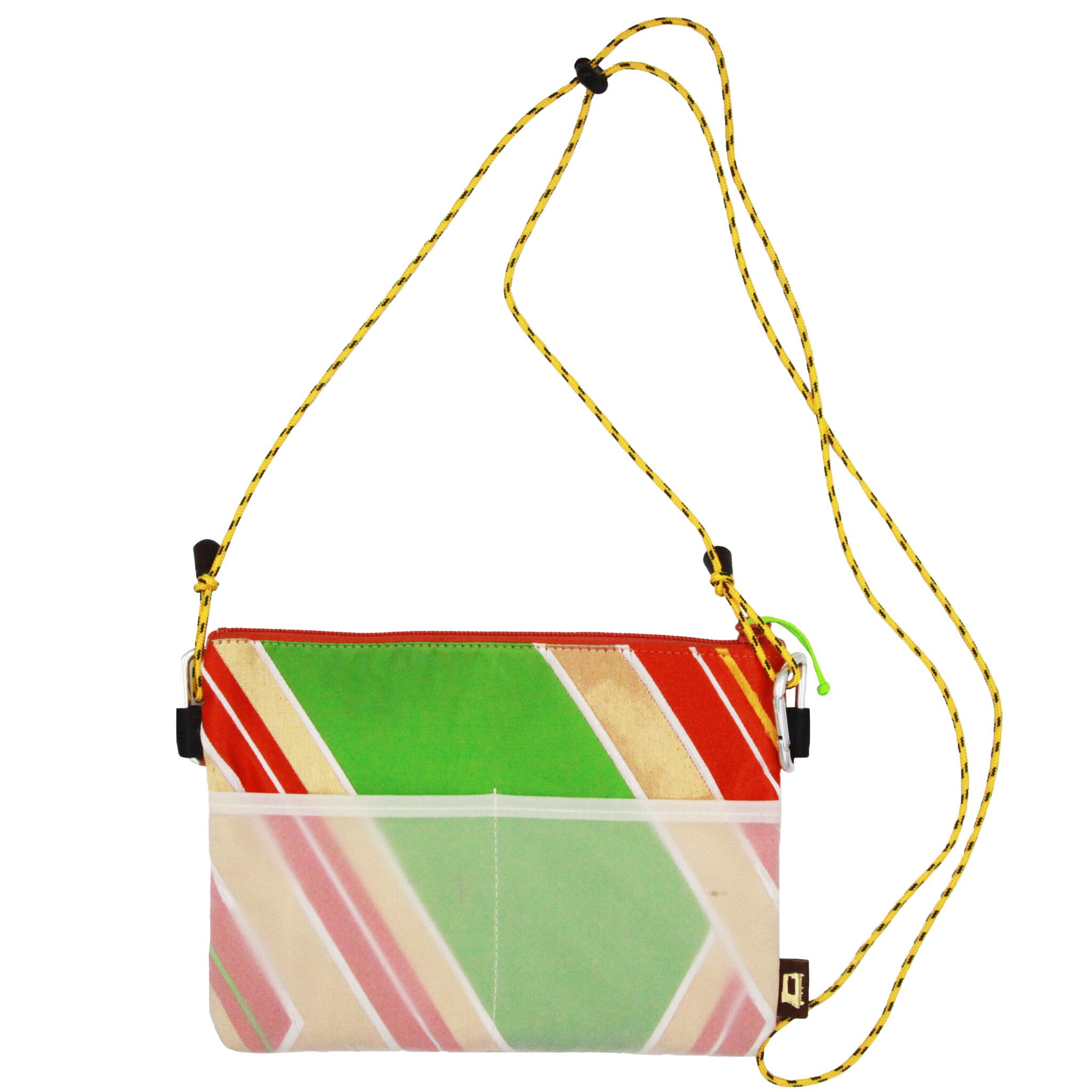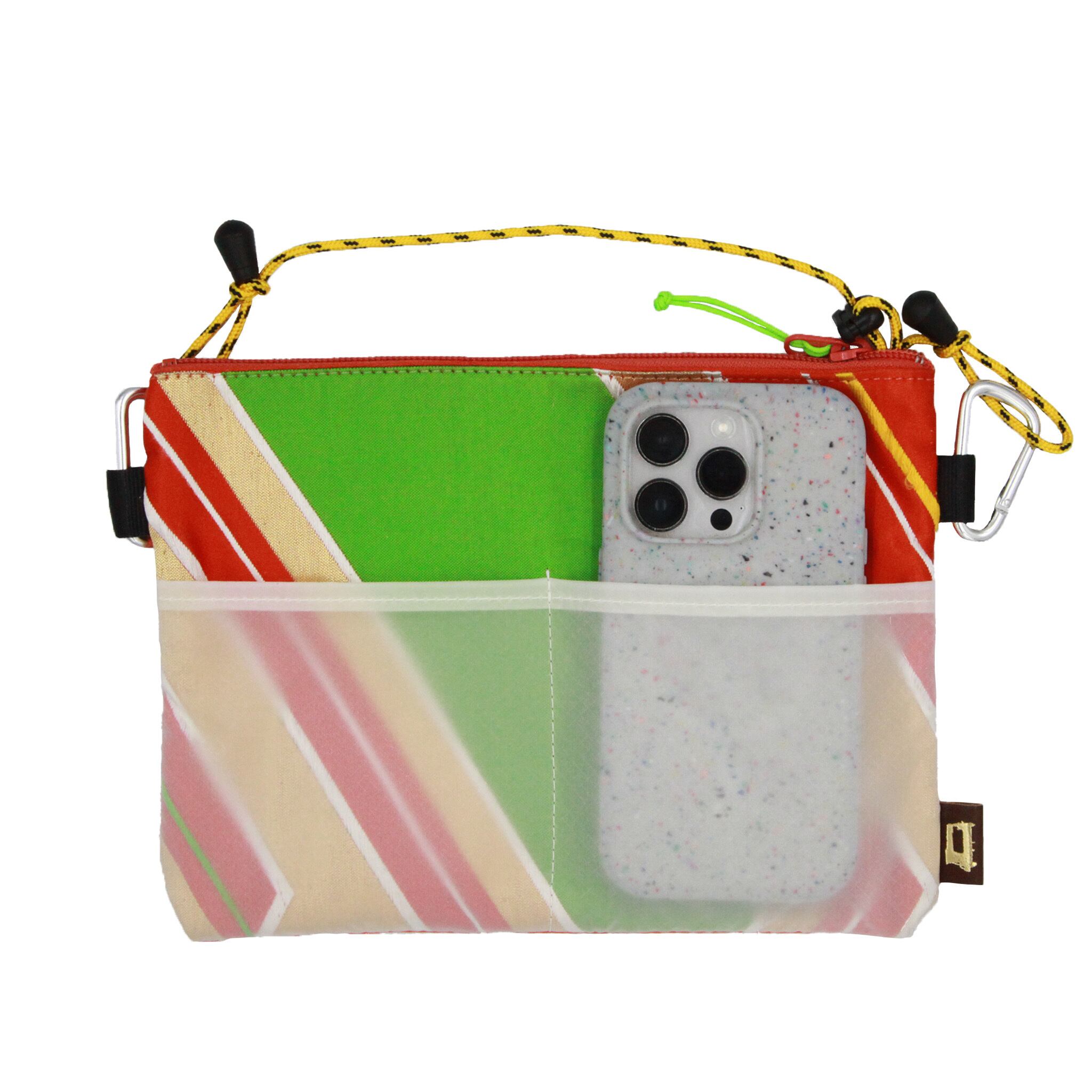 シルクの中古帯やアンティークの帯をデザイナーの感性で選び、現代的なアプローチでナイロン素材とミックスして制作したサコッシュバッグです。フロントに半透明なコーデュラナイロンをポケットとして配置し、シルク生地の保護の意味合いをデザインとしても活かしています。小ロット生産で、様々なテイストがミックスされたアソートの商品です。