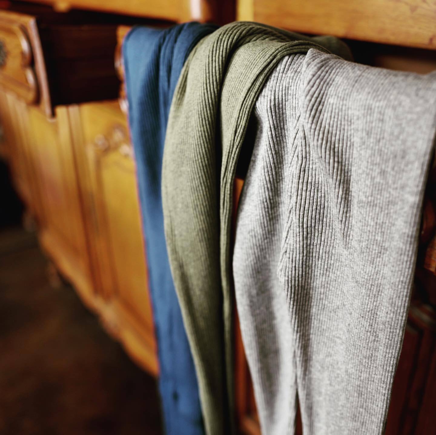 国産の軽くて柔らかい伸縮性のあるリブ生地を使用したレギンス。