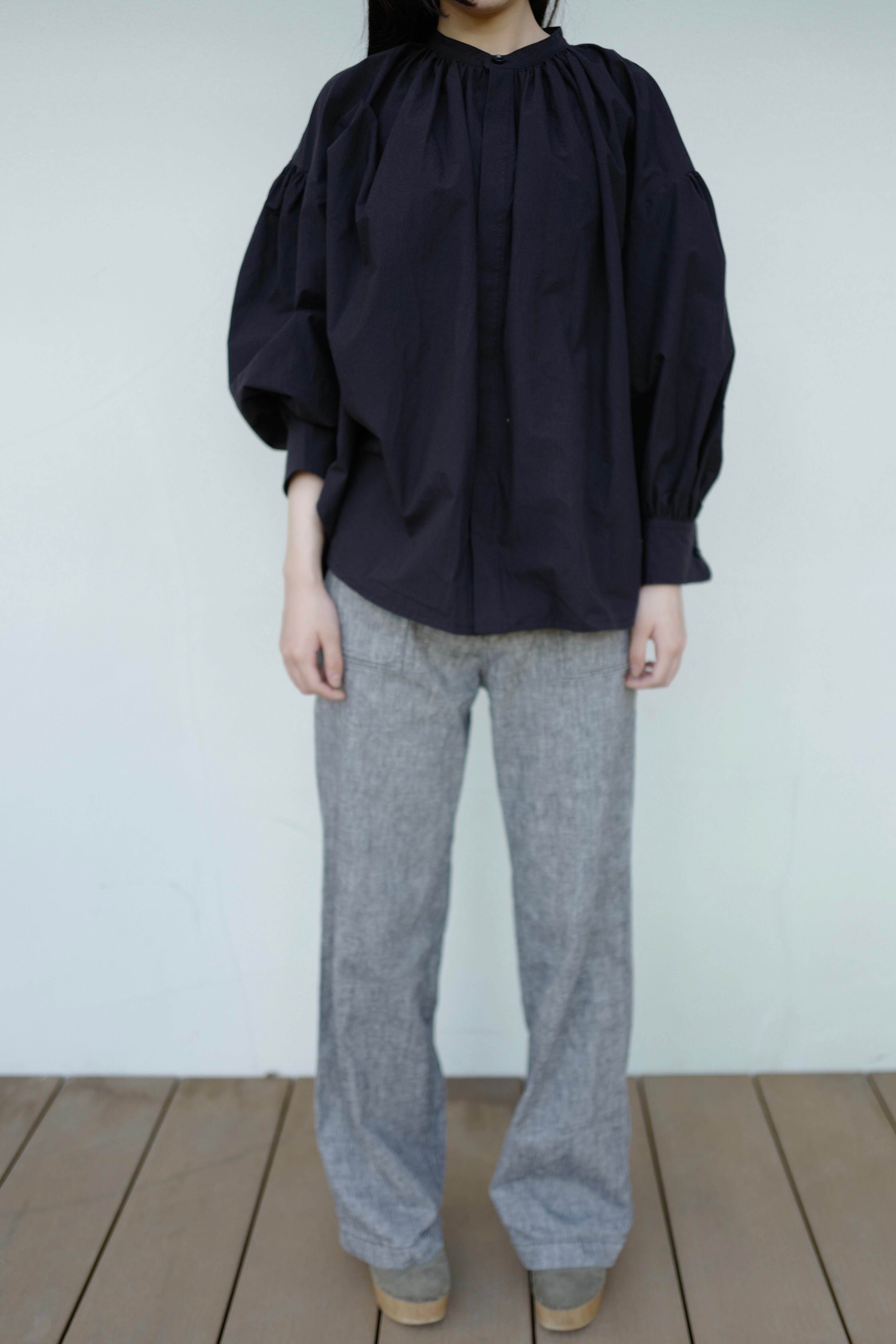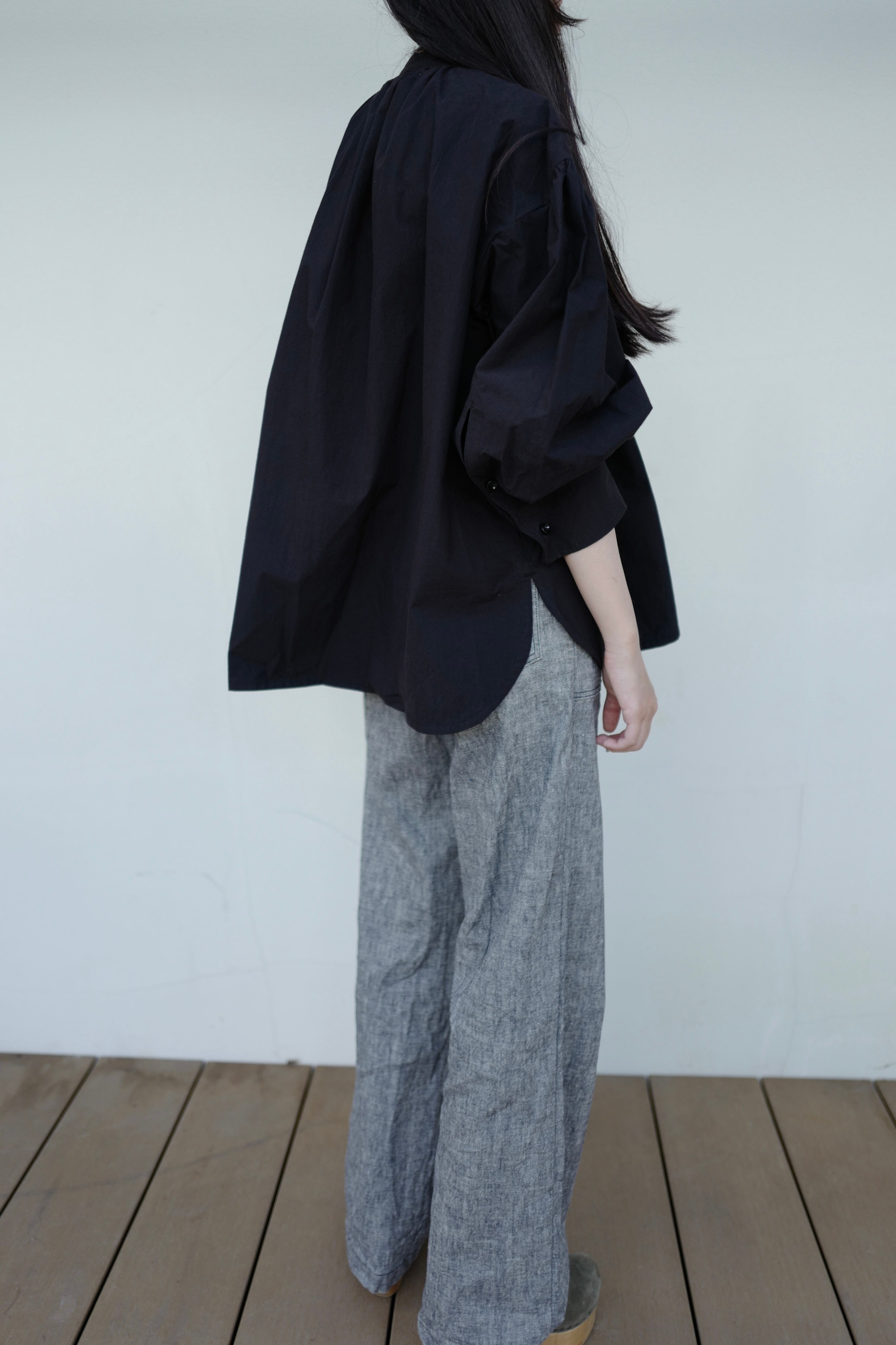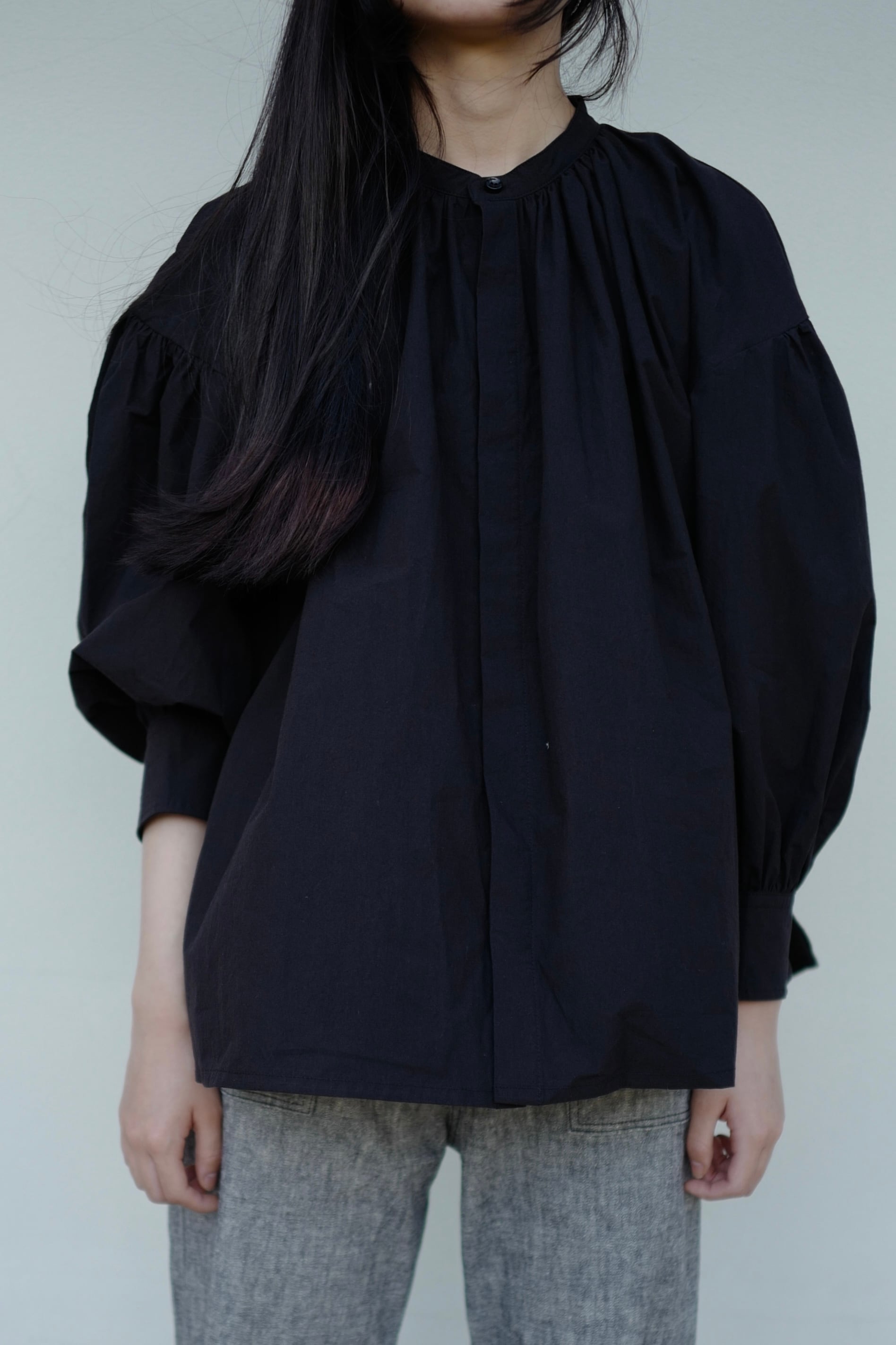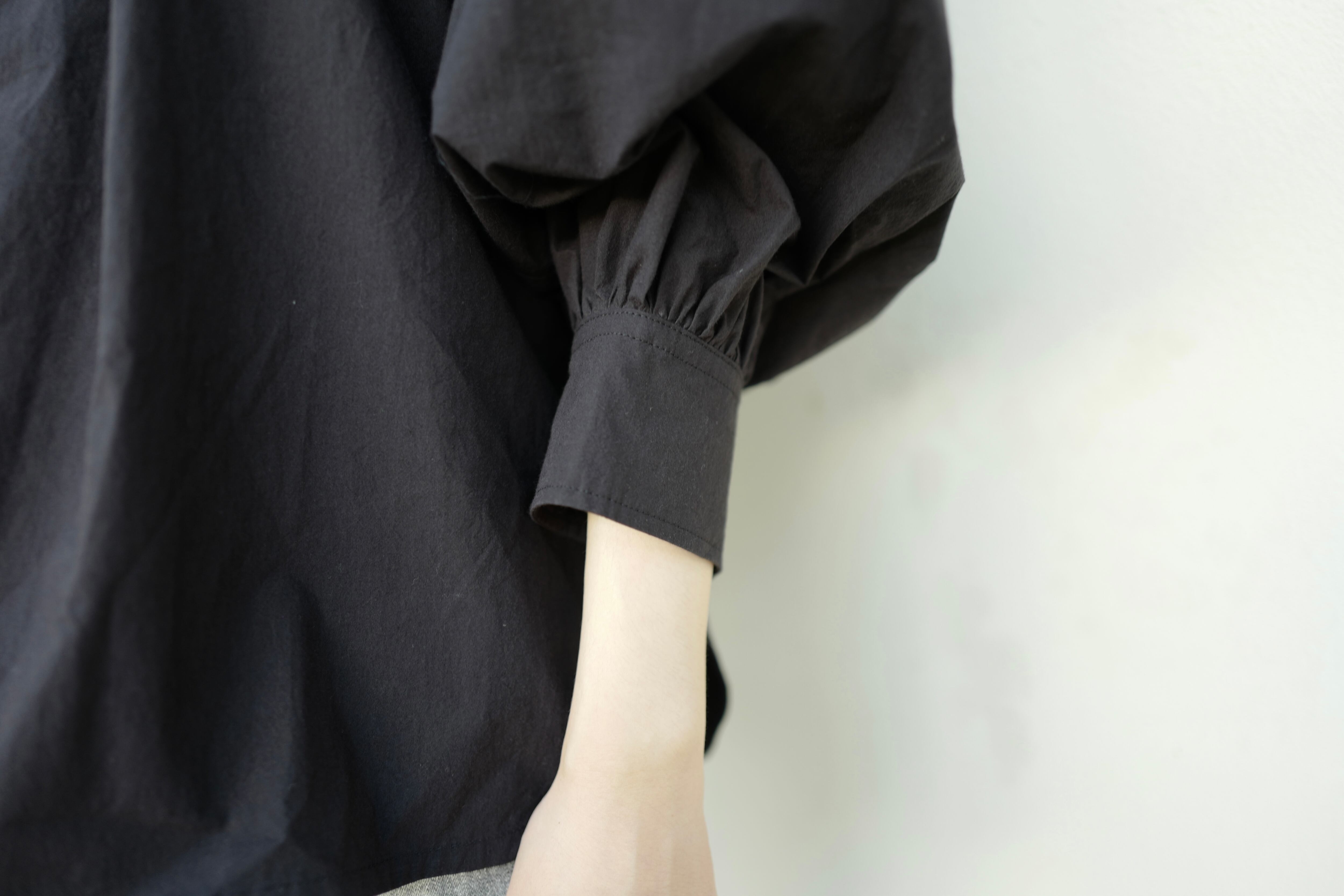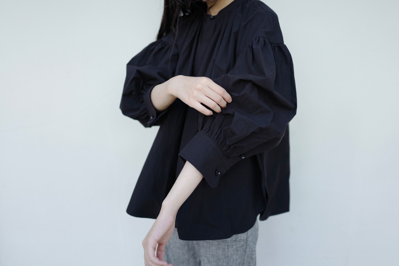 今回のTougher 新作のPUFF SLEEVE GATHER SHIRTSは女性らしいシルエットのパフスリーブシャツで、肘辺りまで上に上げると女性らしいパフスリーブのシルエットがでます。