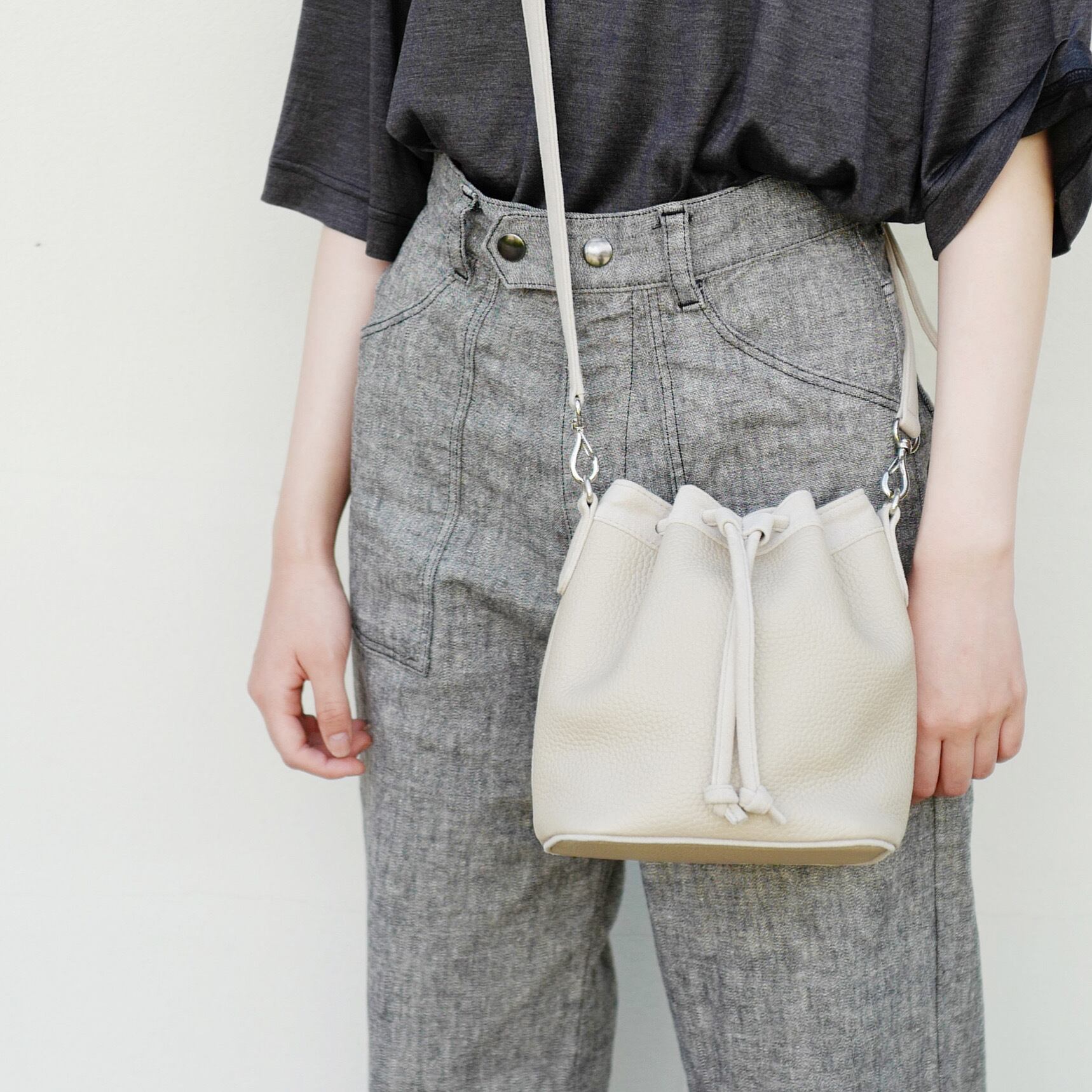 ショルダーとしても、きゅっと絞って手持ちでも使えるドゥローストゥリングデザインは、装いに合わせて表情を変えてくれます。カジュアルからきれいめまで、どんなコーディネートにも自然に馴染みます。