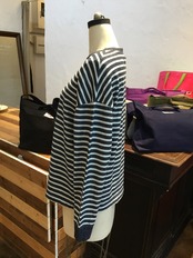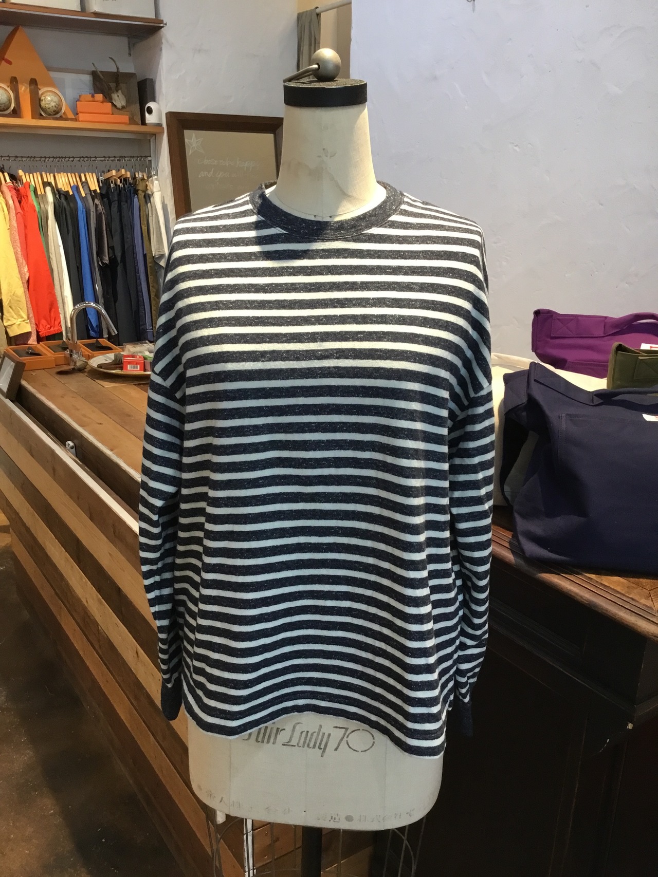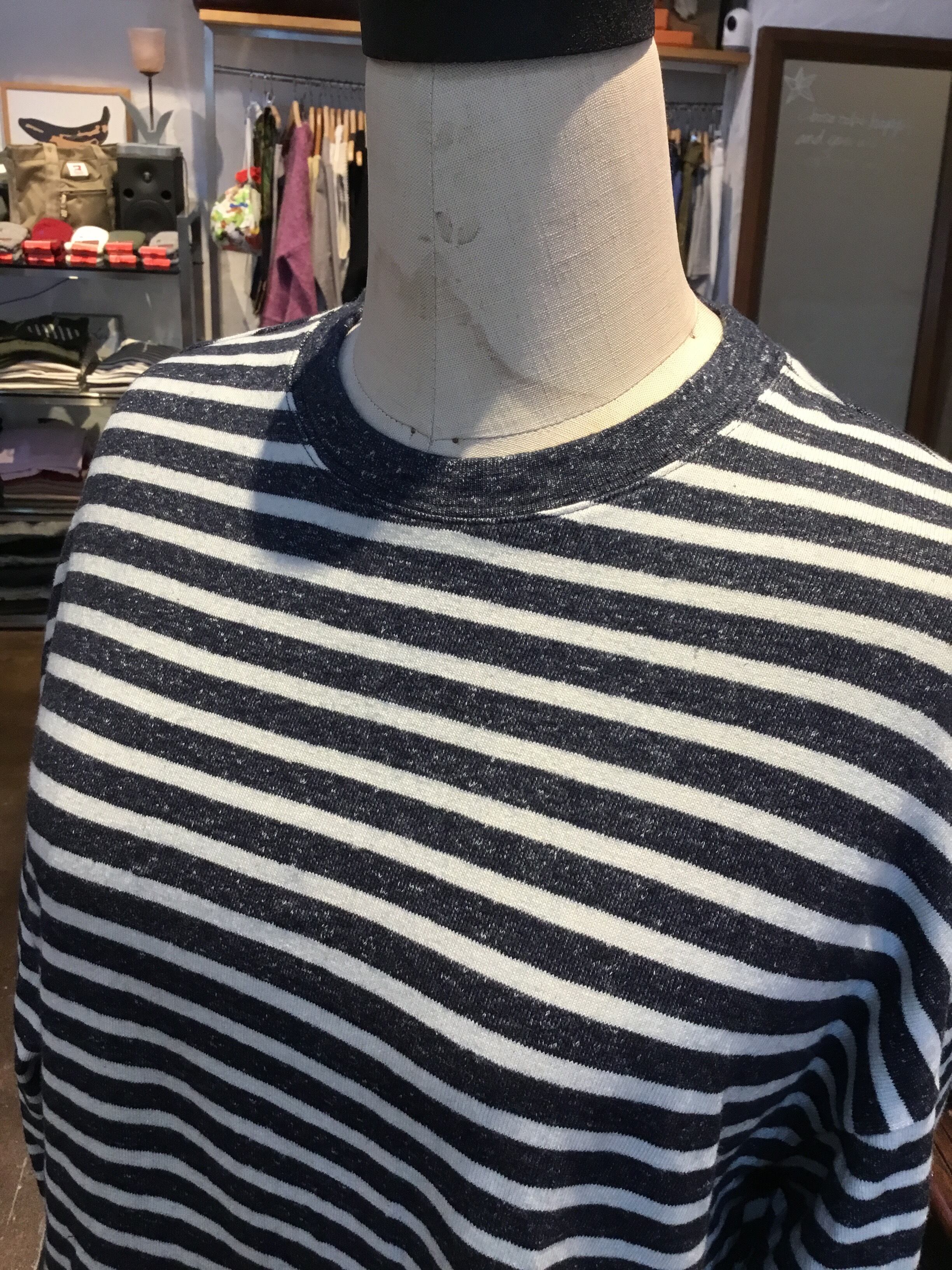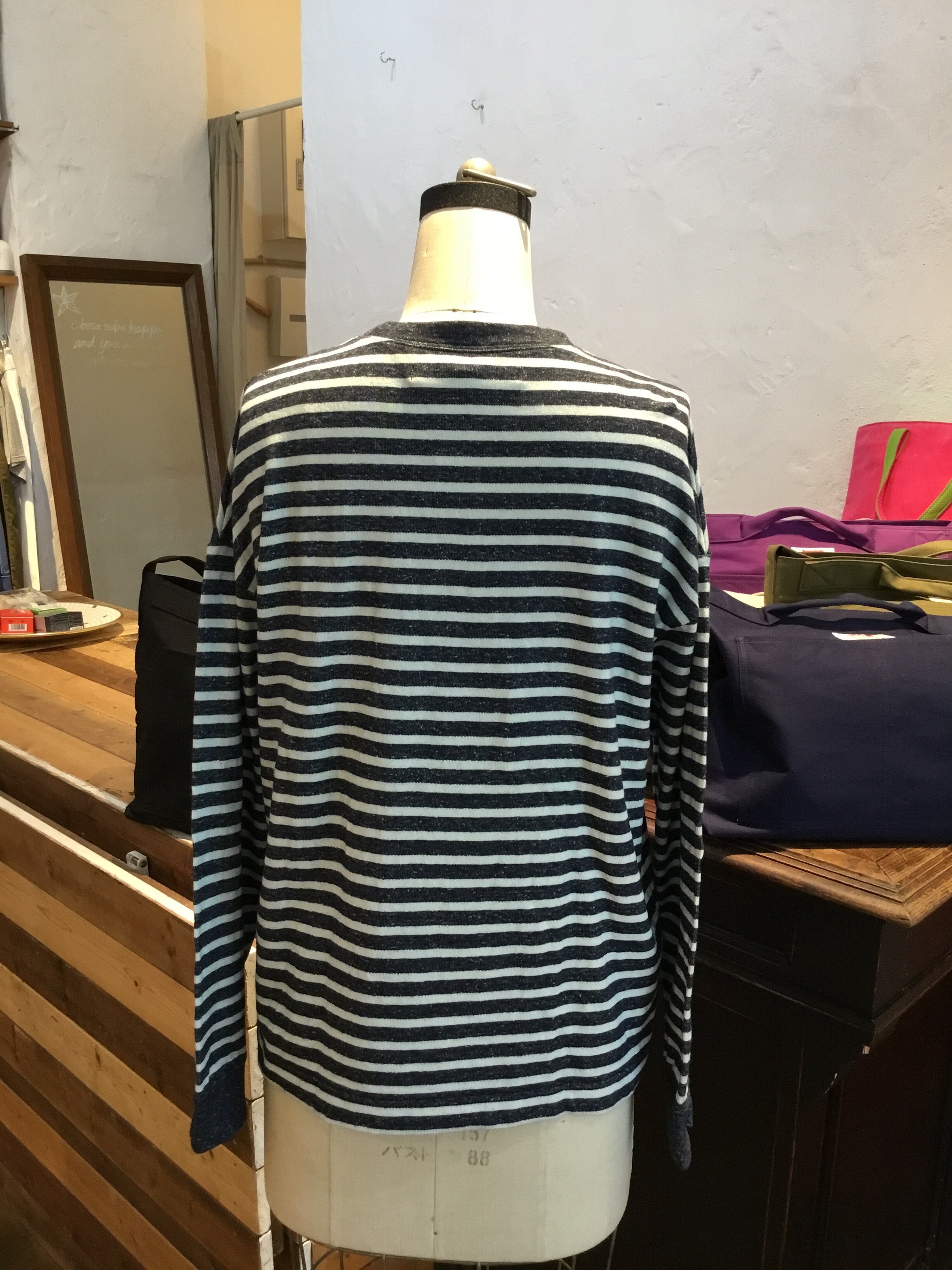 ボーダーのラインを藍染を施した長袖のTシャツ。