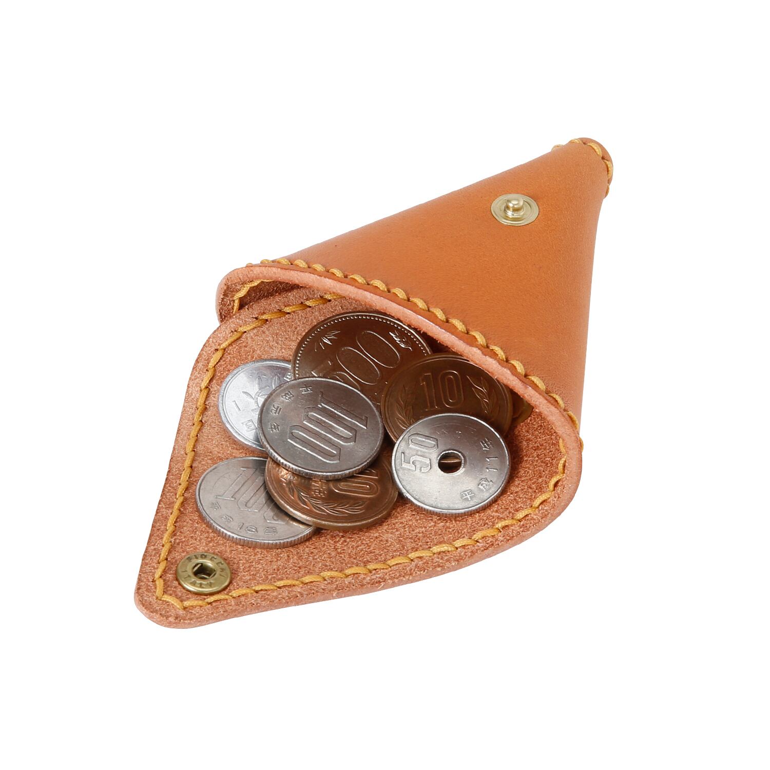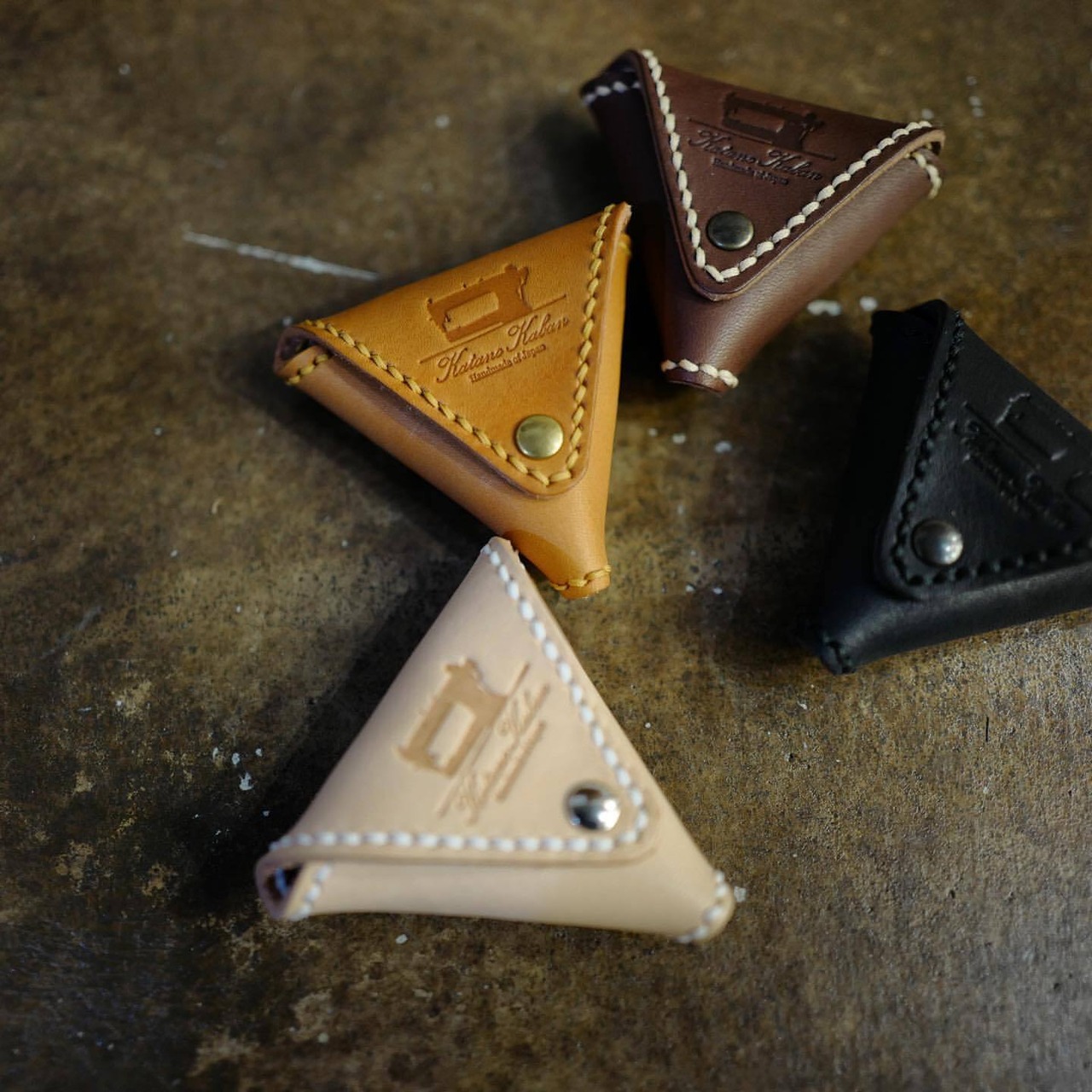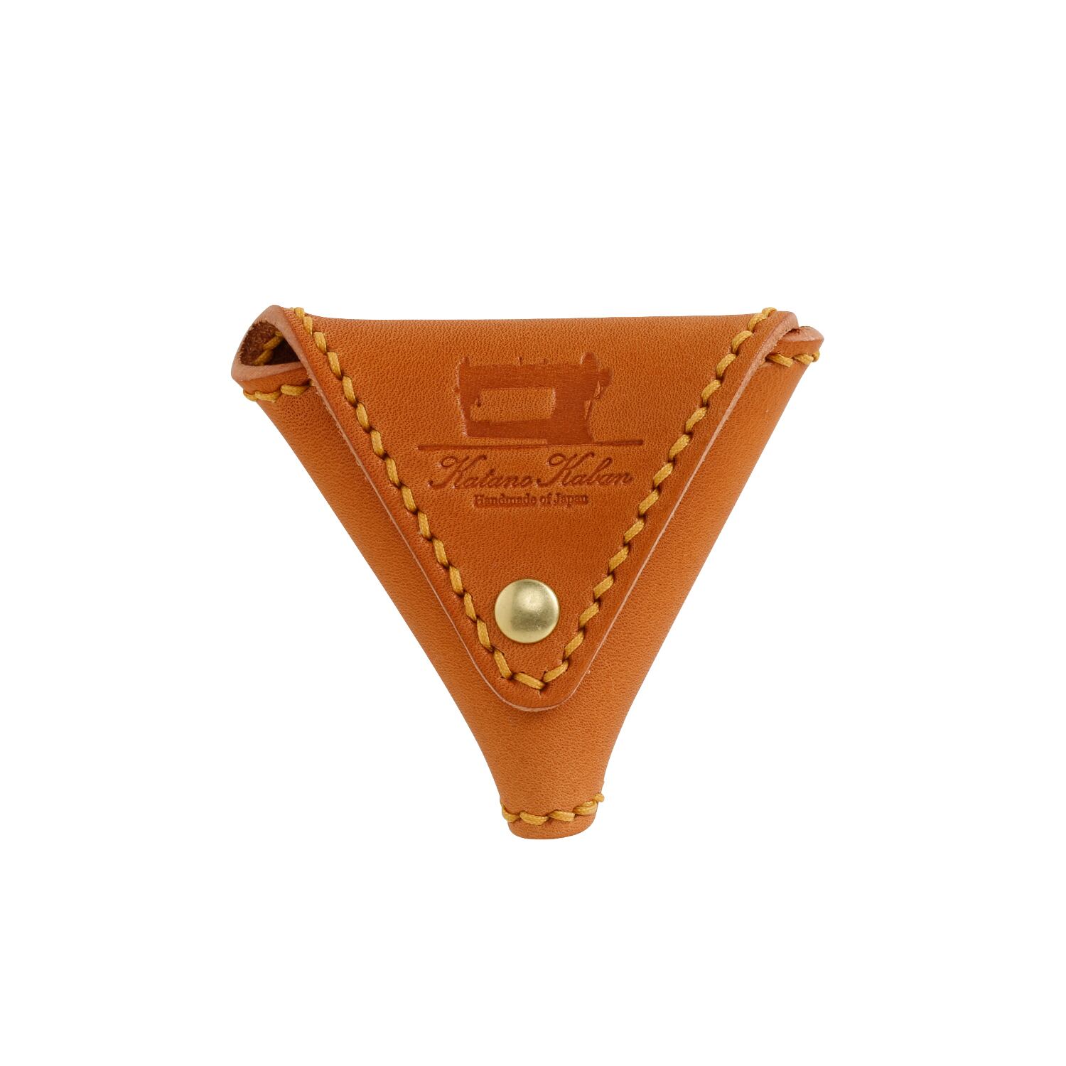 Triangle coin case “ONIGIRI” which is the representative work of Katano Kaban got a new model ONIGIRI MINI. It keeps the existing design which can be opened and closed from the both of front and back side. Outer side is carefully seamed with decorative stitching, which makes product sturdy and also give the warmth of handmade. Snap button is ALFA-0 of Fiocchi . You will become addicted to the popping sound when you open and close the snap button. This coin case has unique triangle outlook and you can enjoy aging of tanned leather.