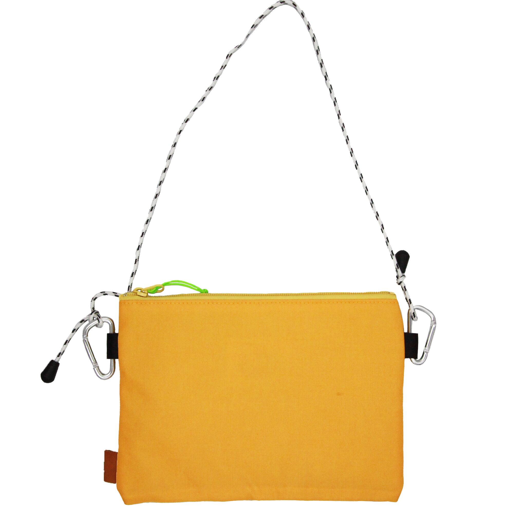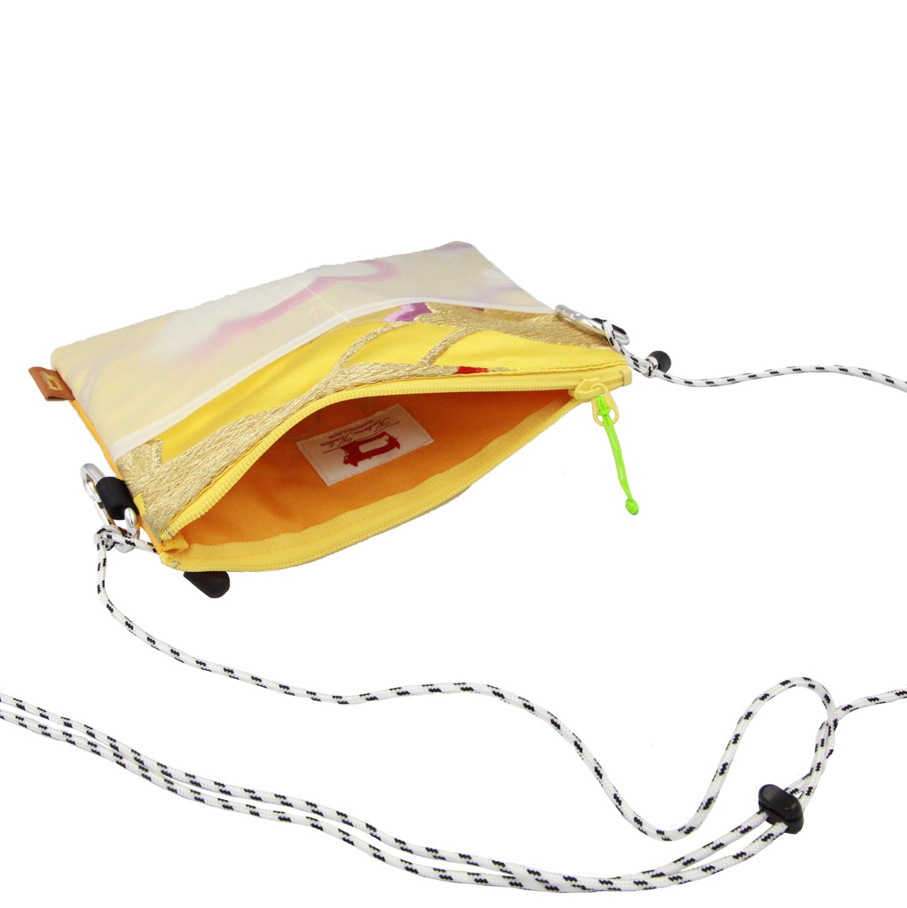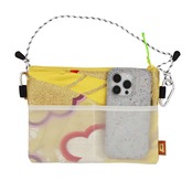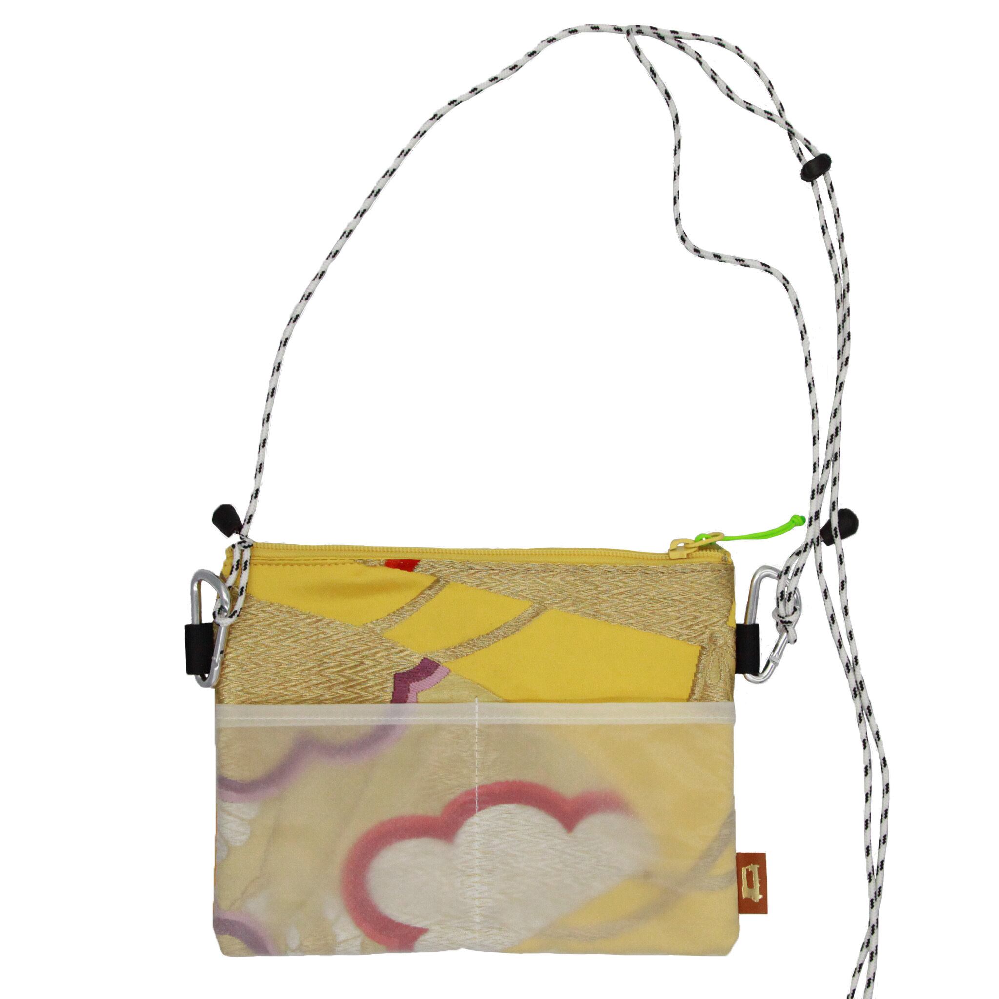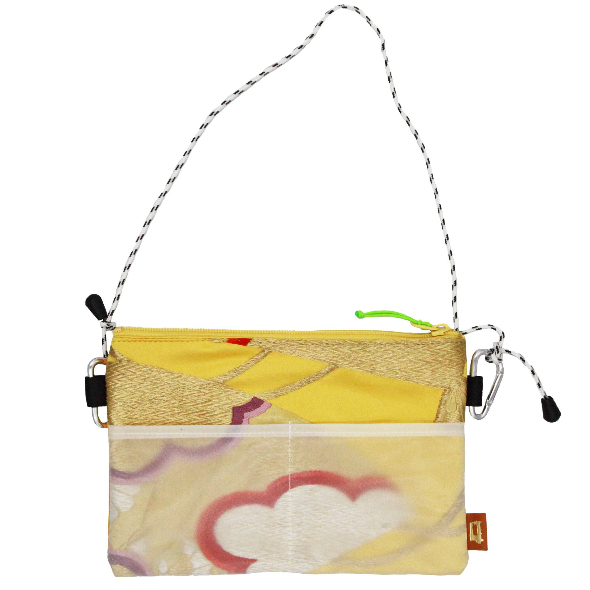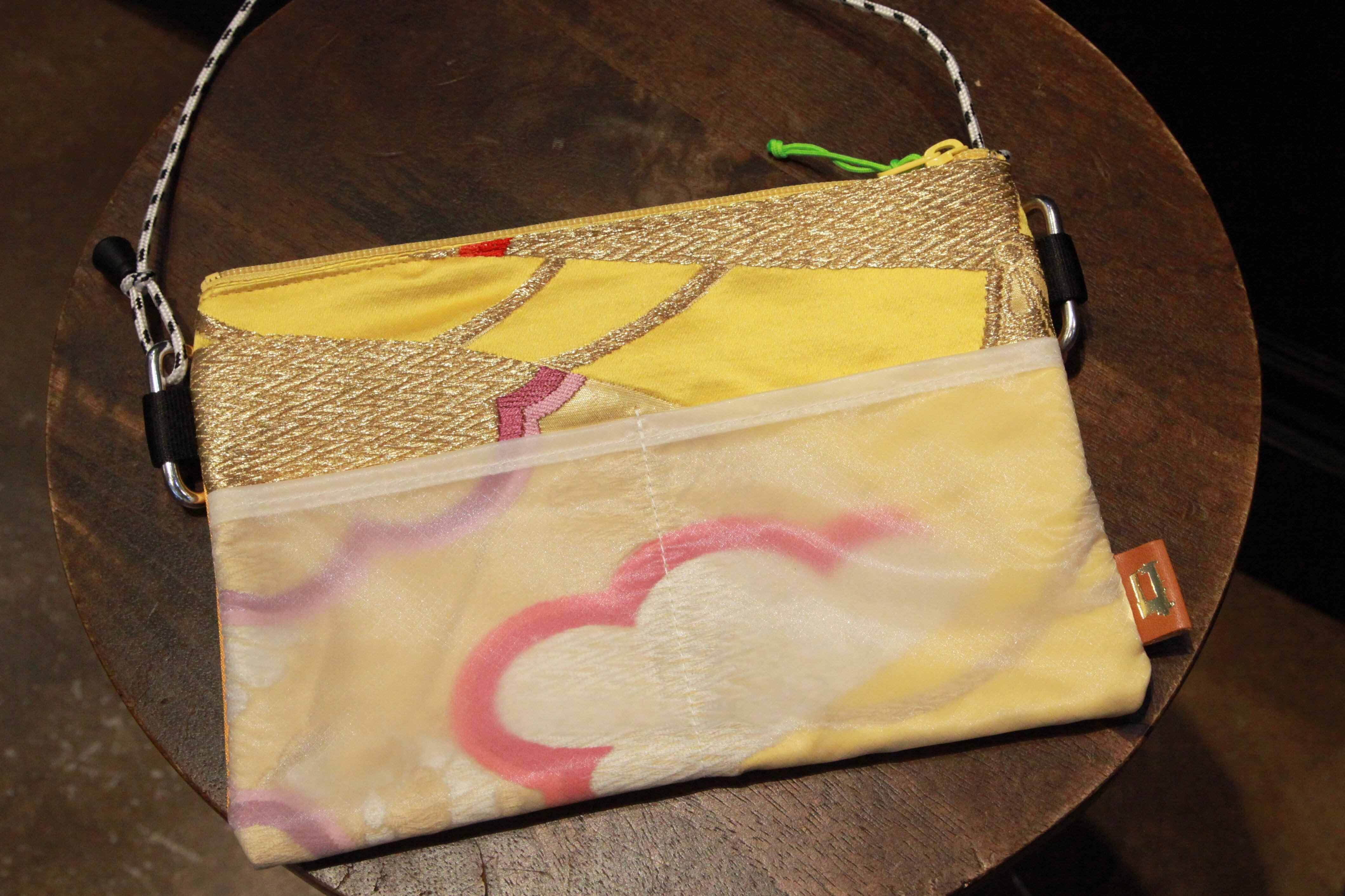 シルクの中古帯やアンティークの帯をデザイナーの感性で選び、現代的なアプローチでナイロン素材とミックスして制作したサコッシュバッグです。フロントに半透明なコーデュラナイロンをポケットとして配置し、シルク生地の保護の意味合いをデザインとしても活かしています。小ロット生産で、様々なテイストがミックスされたアソートの商品です。
