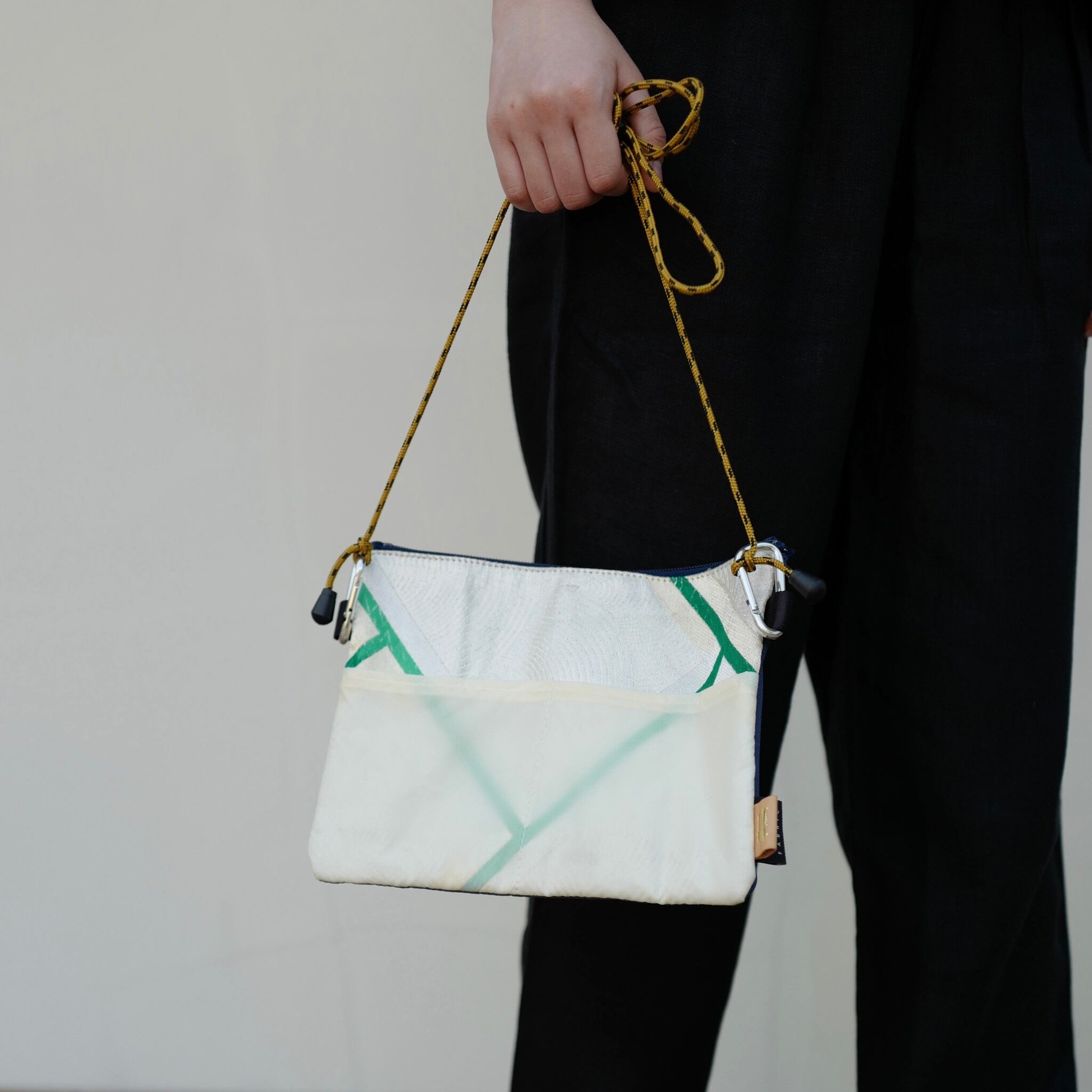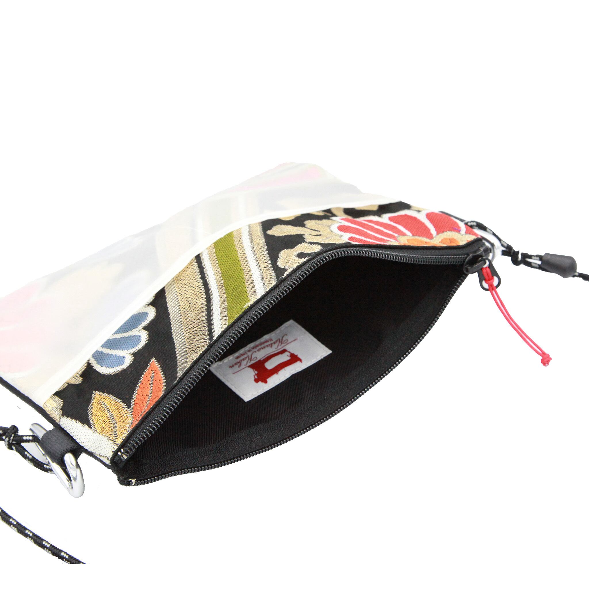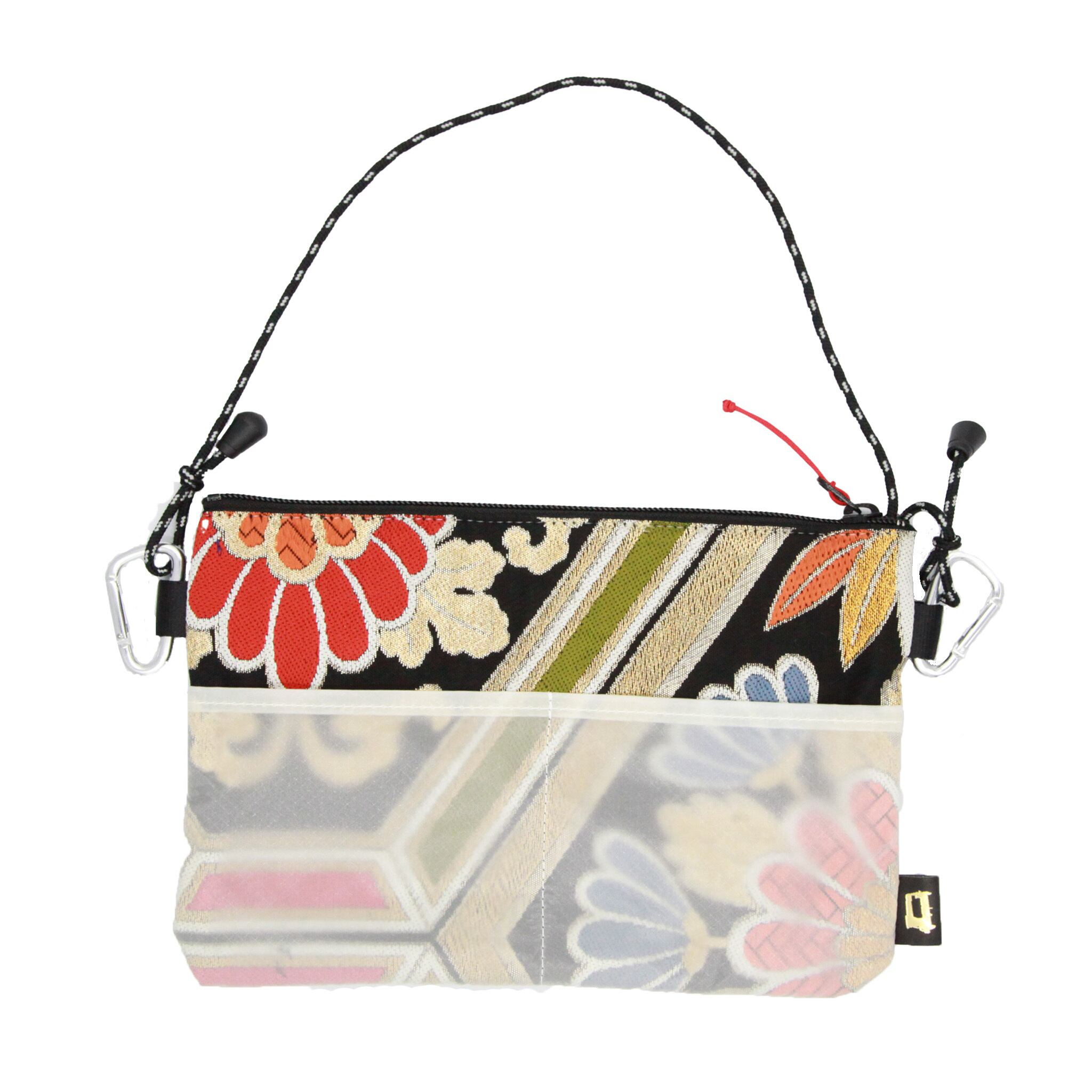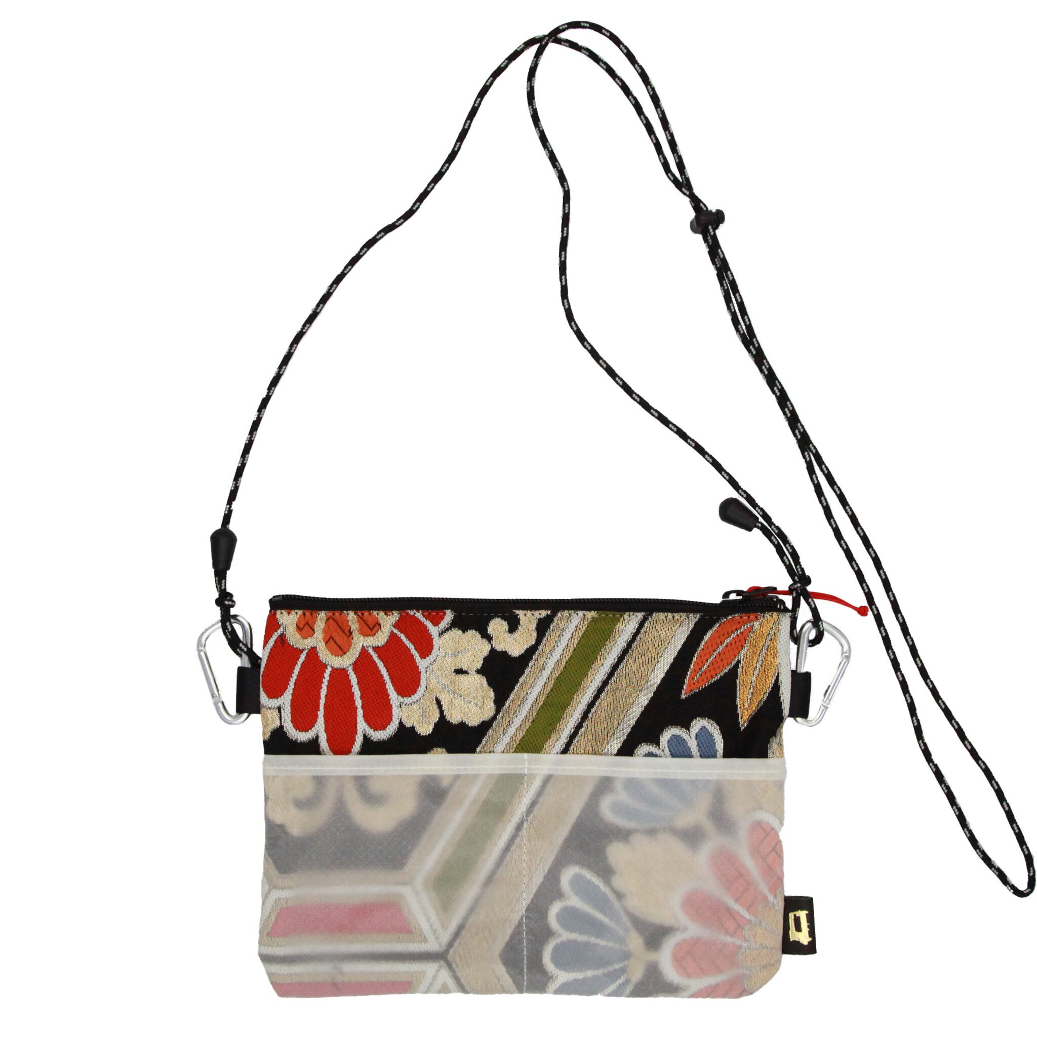シルクの中古帯やアンティークの帯をデザイナーの感性で選び、現代的なアプローチでナイロン素材とミックスして制作したサコッシュバッグです。フロントに半透明なコーデュラナイロンをポケットとして配置し、シルク生地の保護の意味合いをデザインとしても活かしています。小ロット生産で、様々なテイストがミックスされたアソートの商品です。