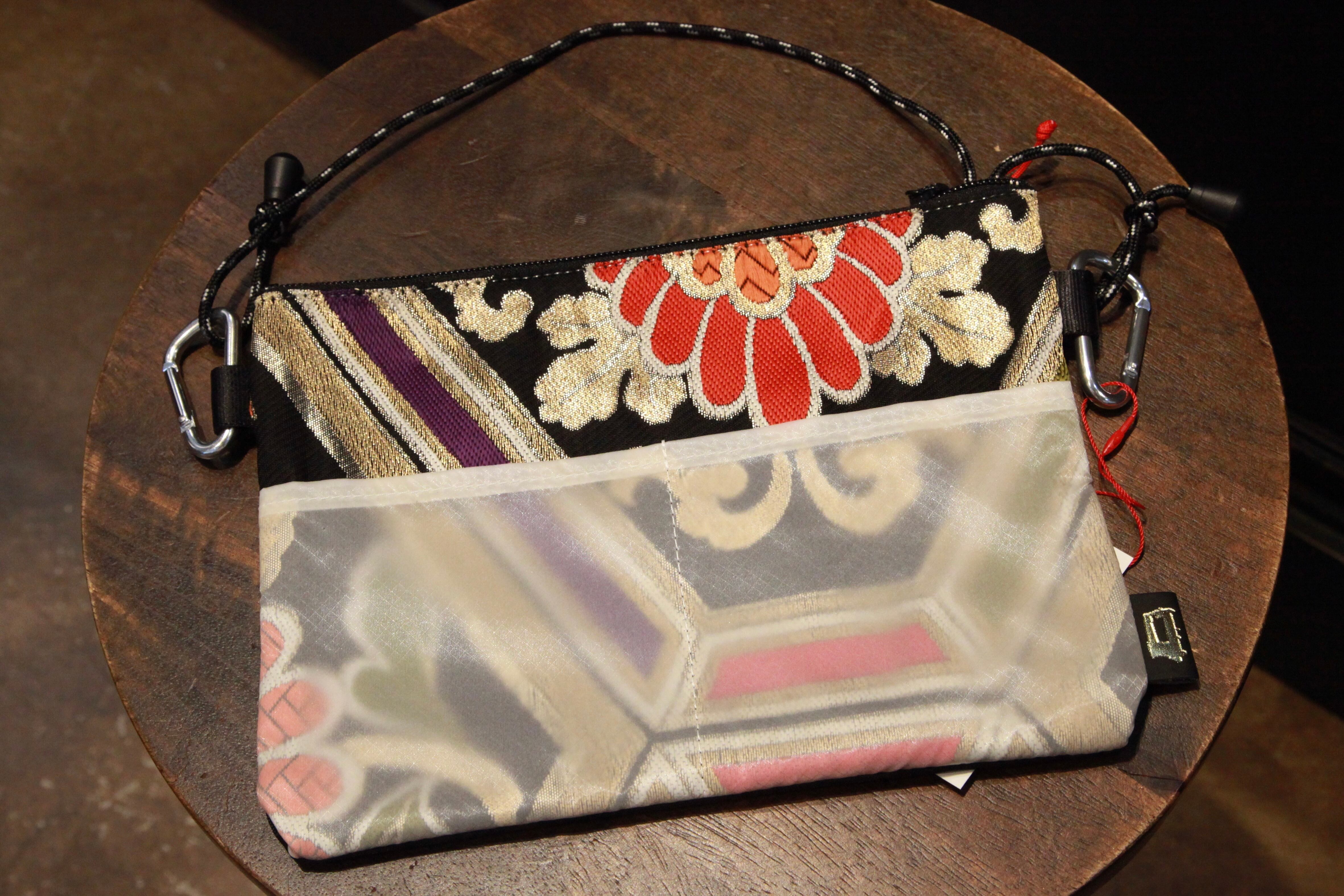 OBI sacoche is made by combination of modern sense and classic material. Used silk sash or antique sash is selected by designer and these classic fabric is mixed with nylon material. Translucent Cordura nylon is used as a material of front pocket, which also help to protect the silk fabric.
