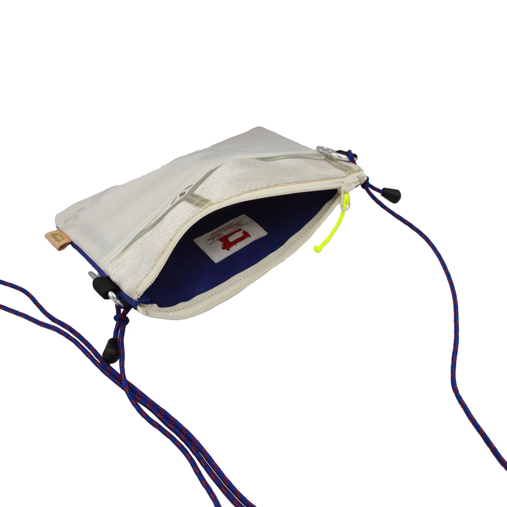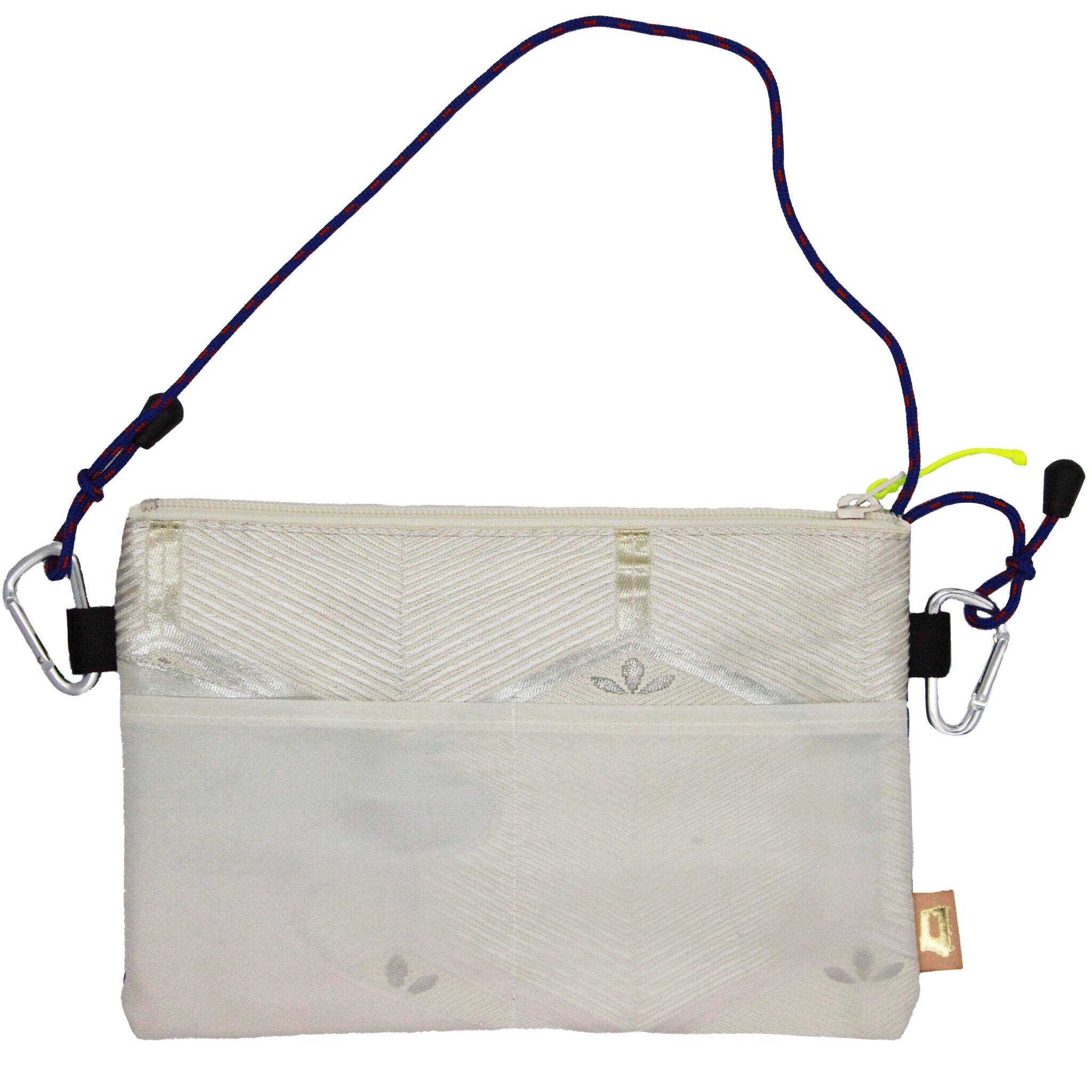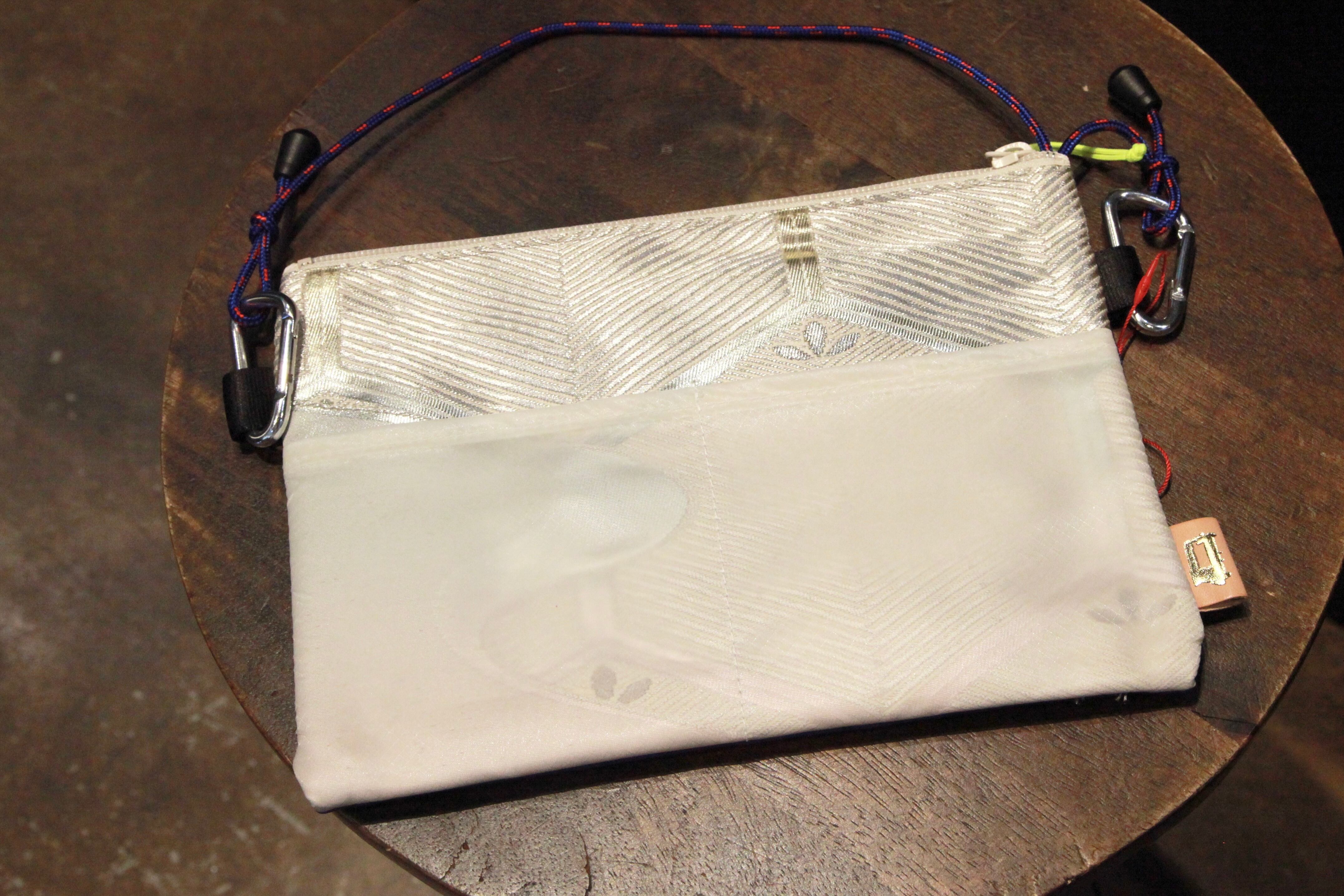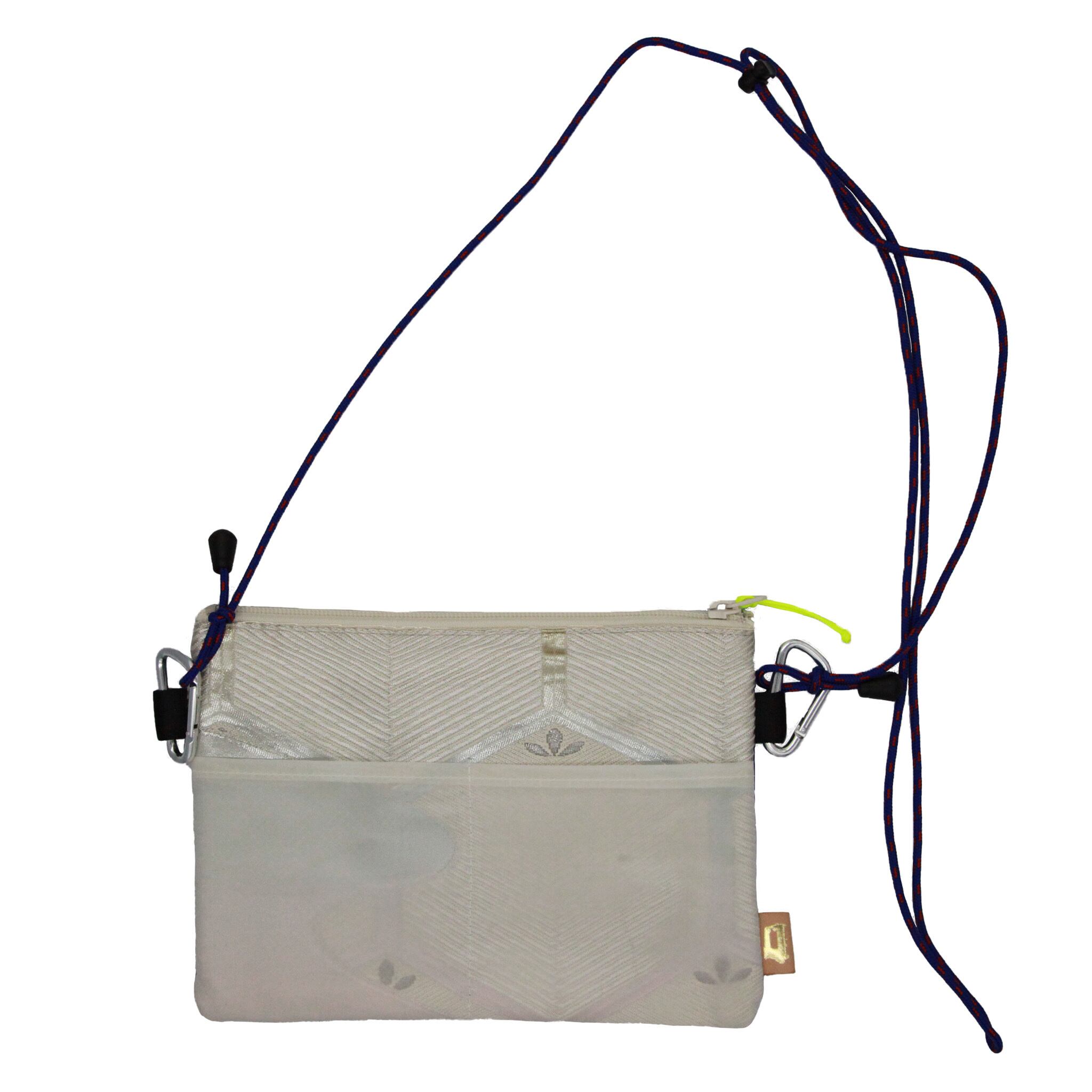 シルクの中古帯やアンティークの帯をデザイナーの感性で選び、現代的なアプローチでナイロン素材とミックスして制作したサコッシュバッグです。フロントに半透明なコーデュラナイロンをポケットとして配置し、シルク生地の保護の意味合いをデザインとしても活かしています。小ロット生産で、様々なテイストがミックスされたアソートの商品です。