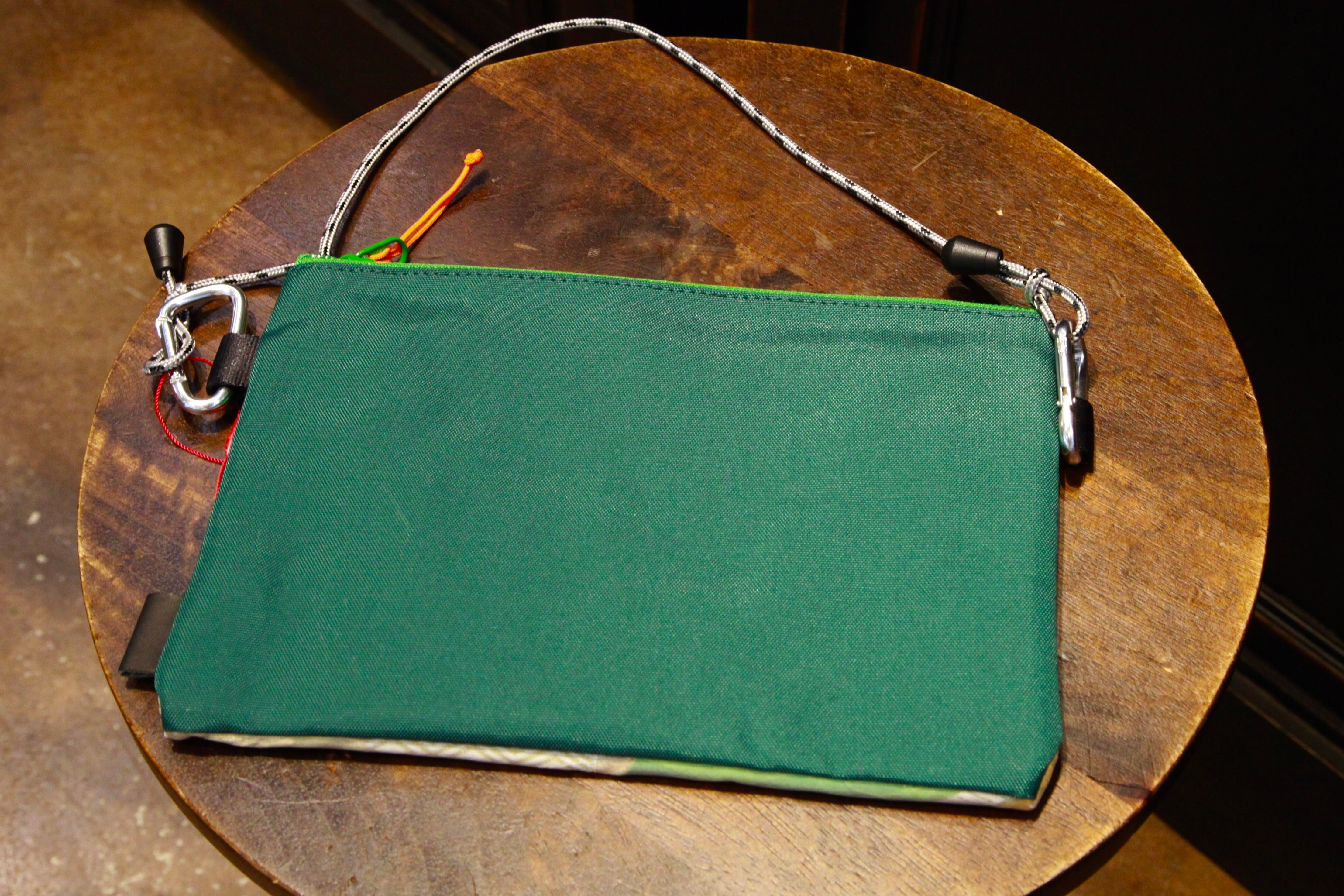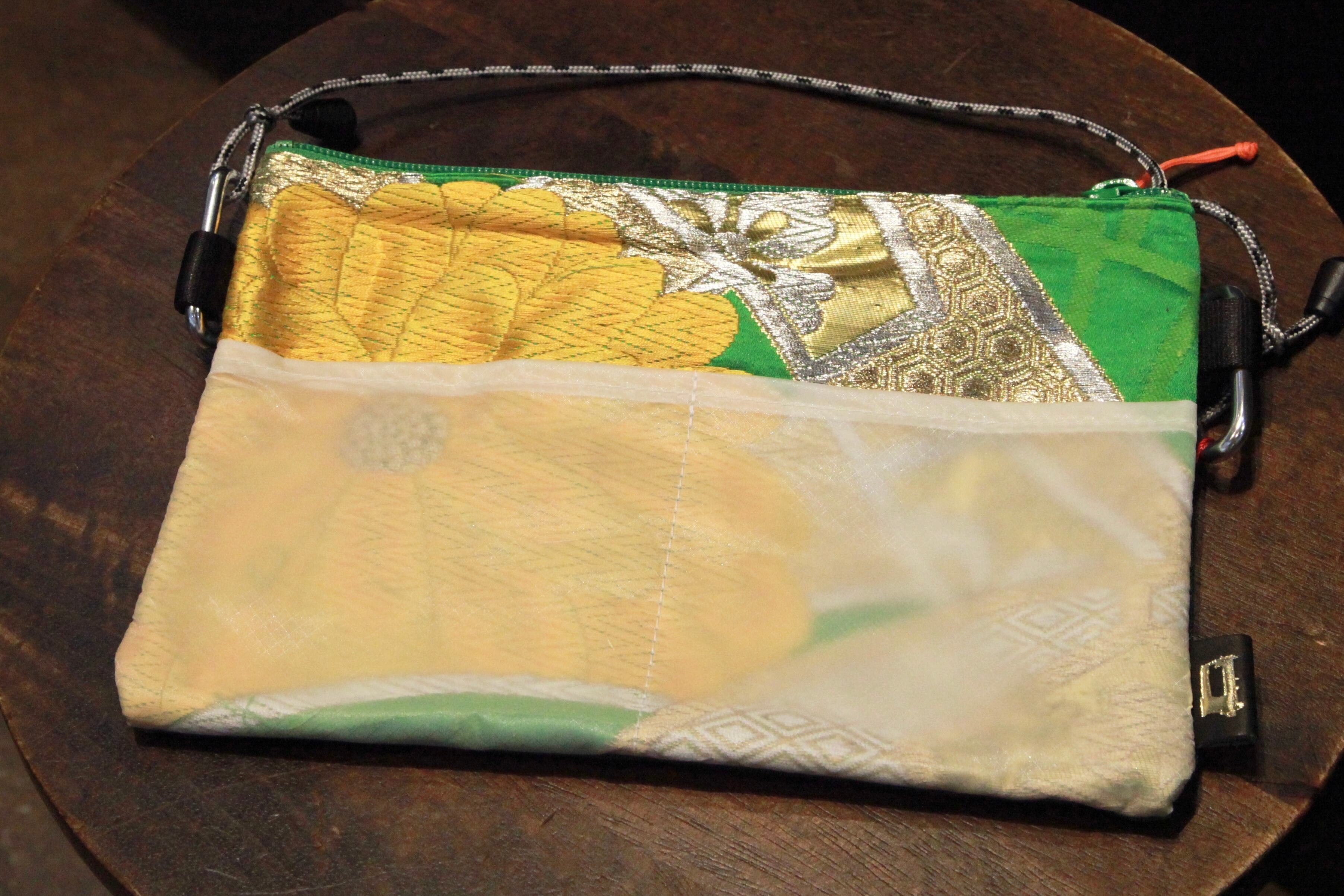 OBI sacoche is made by combination of modern sense and classic material. Used silk sash or antique sash is selected by designer and these classic fabric is mixed with nylon material. Translucent Cordura nylon is used as a material of front pocket, which also help to protect the silk fabric.