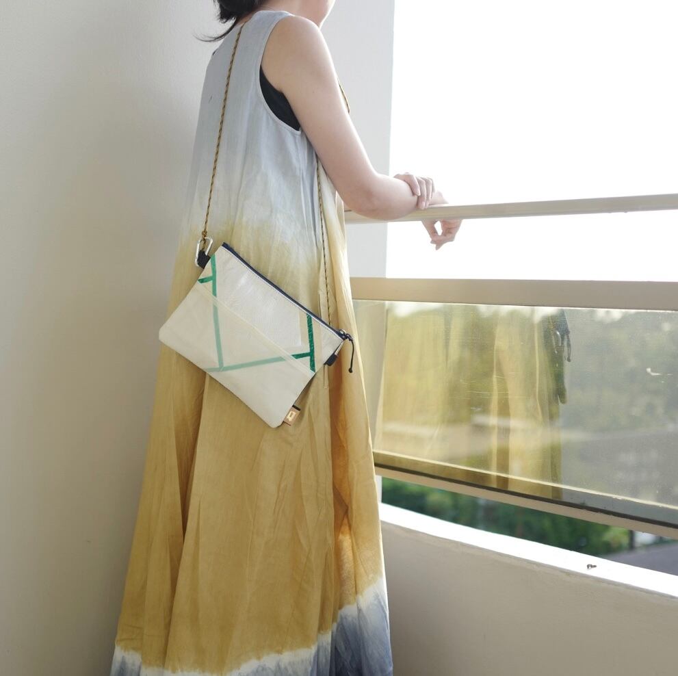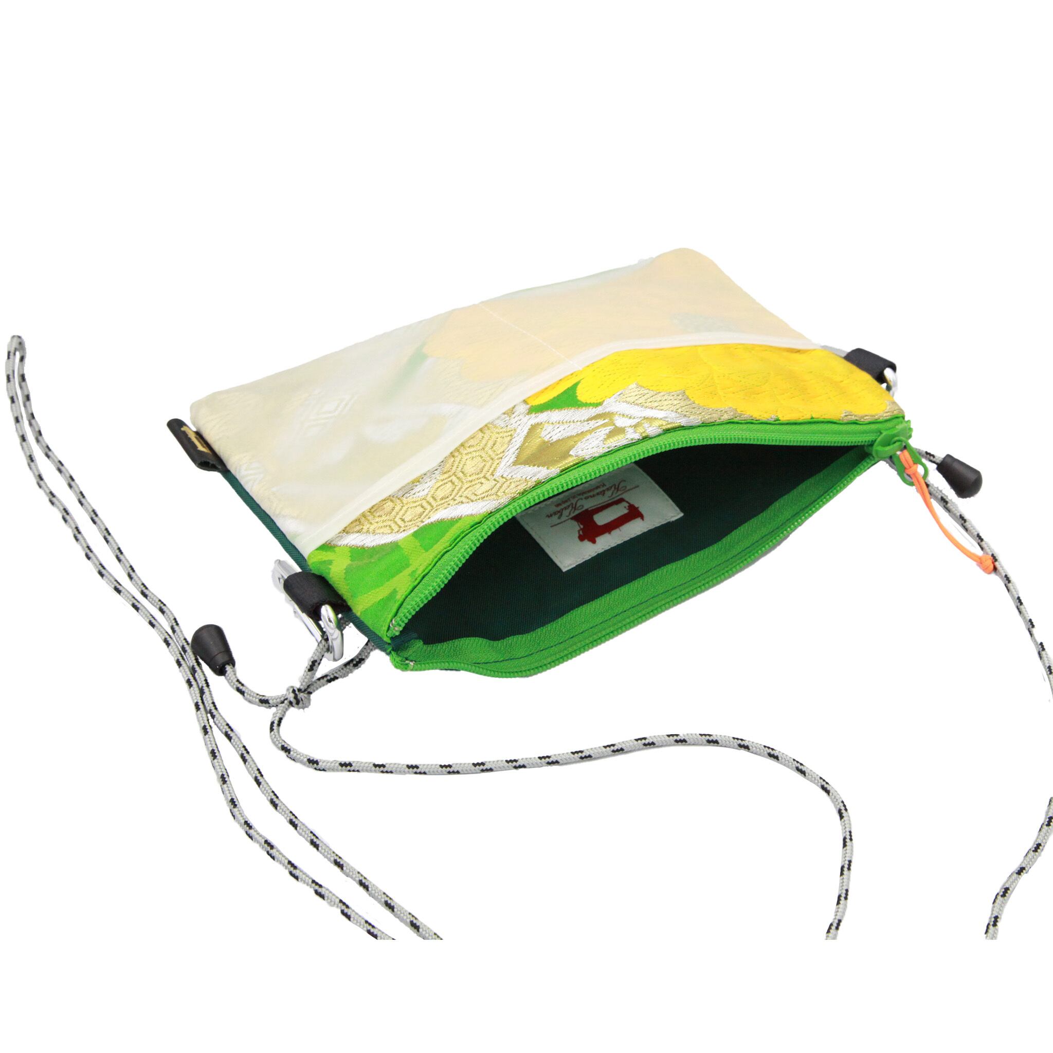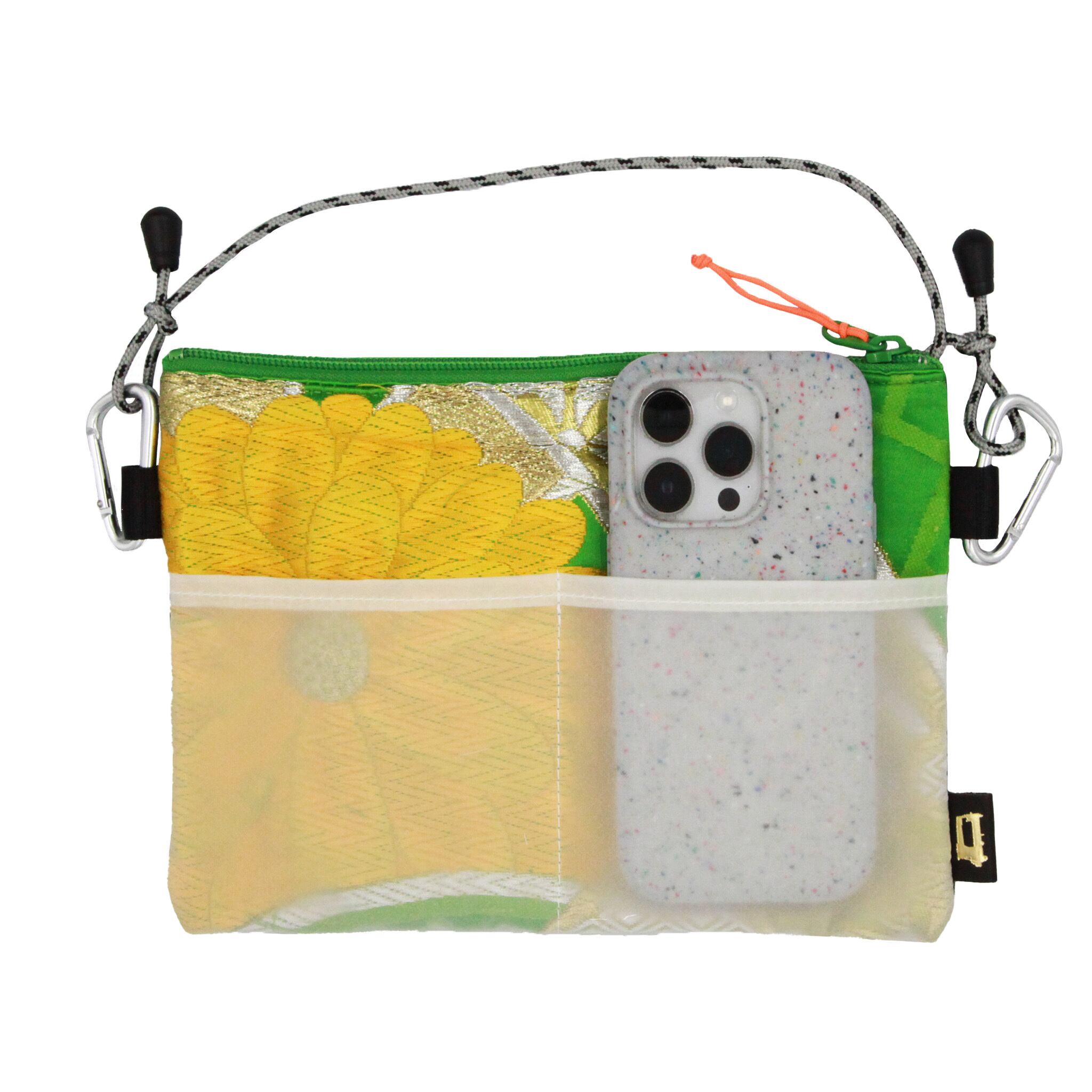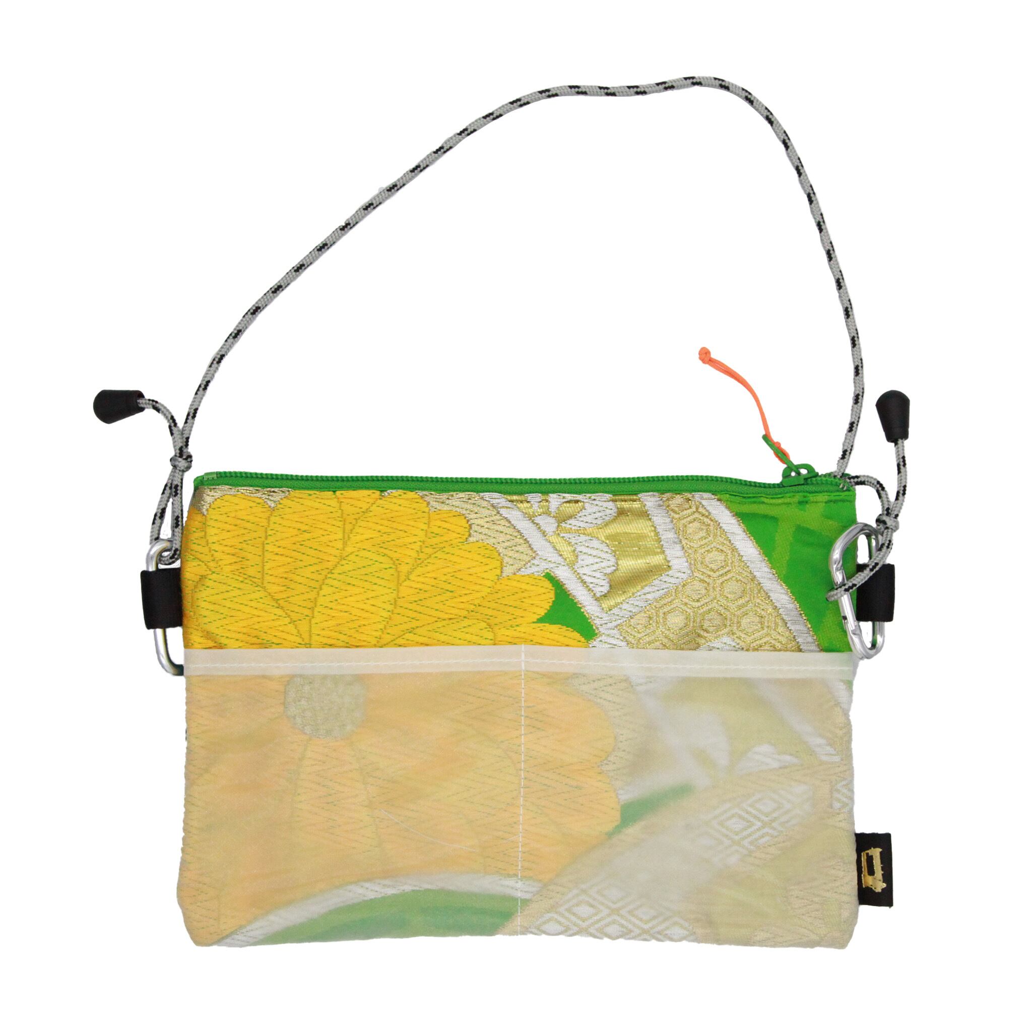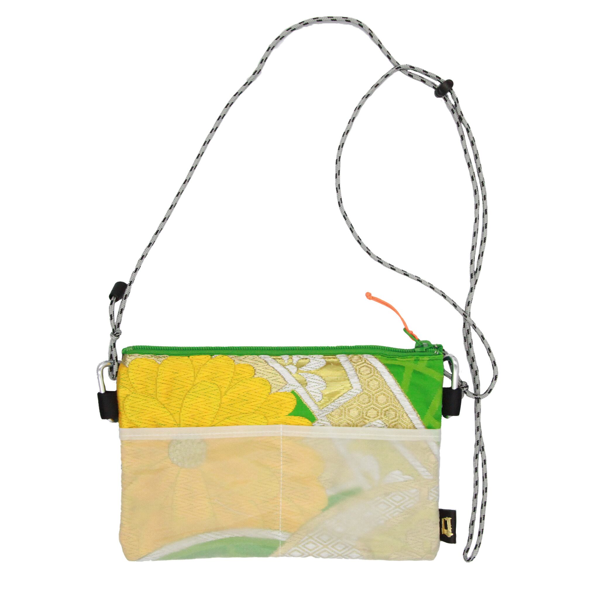 シルクの中古帯やアンティークの帯をデザイナーの感性で選び、現代的なアプローチでナイロン素材とミックスして制作したサコッシュバッグです。フロントに半透明なコーデュラナイロンをポケットとして配置し、シルク生地の保護の意味合いをデザインとしても活かしています。小ロット生産で、様々なテイストがミックスされたアソートの商品です。