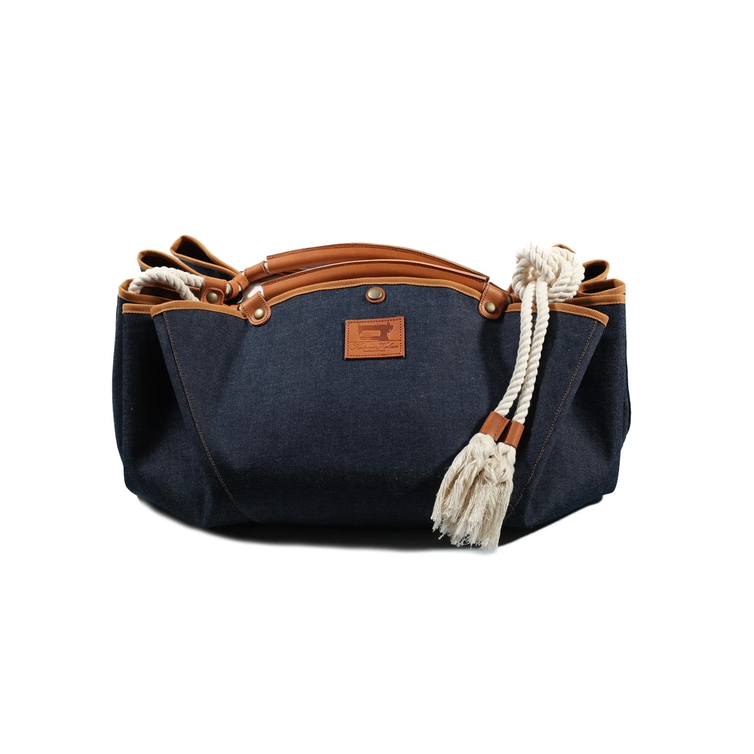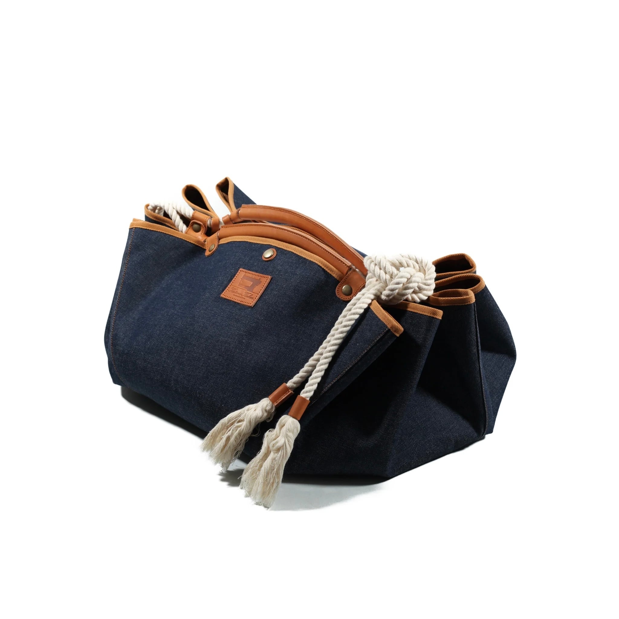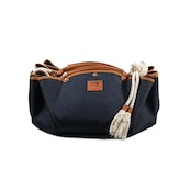MATERIAL : 表地 – 綿100%、裏地 – ナイロン100%防水加工、テープ – アクリル100%、持ち手 – 牛ヌメ革、ロープ – ナイロン100%