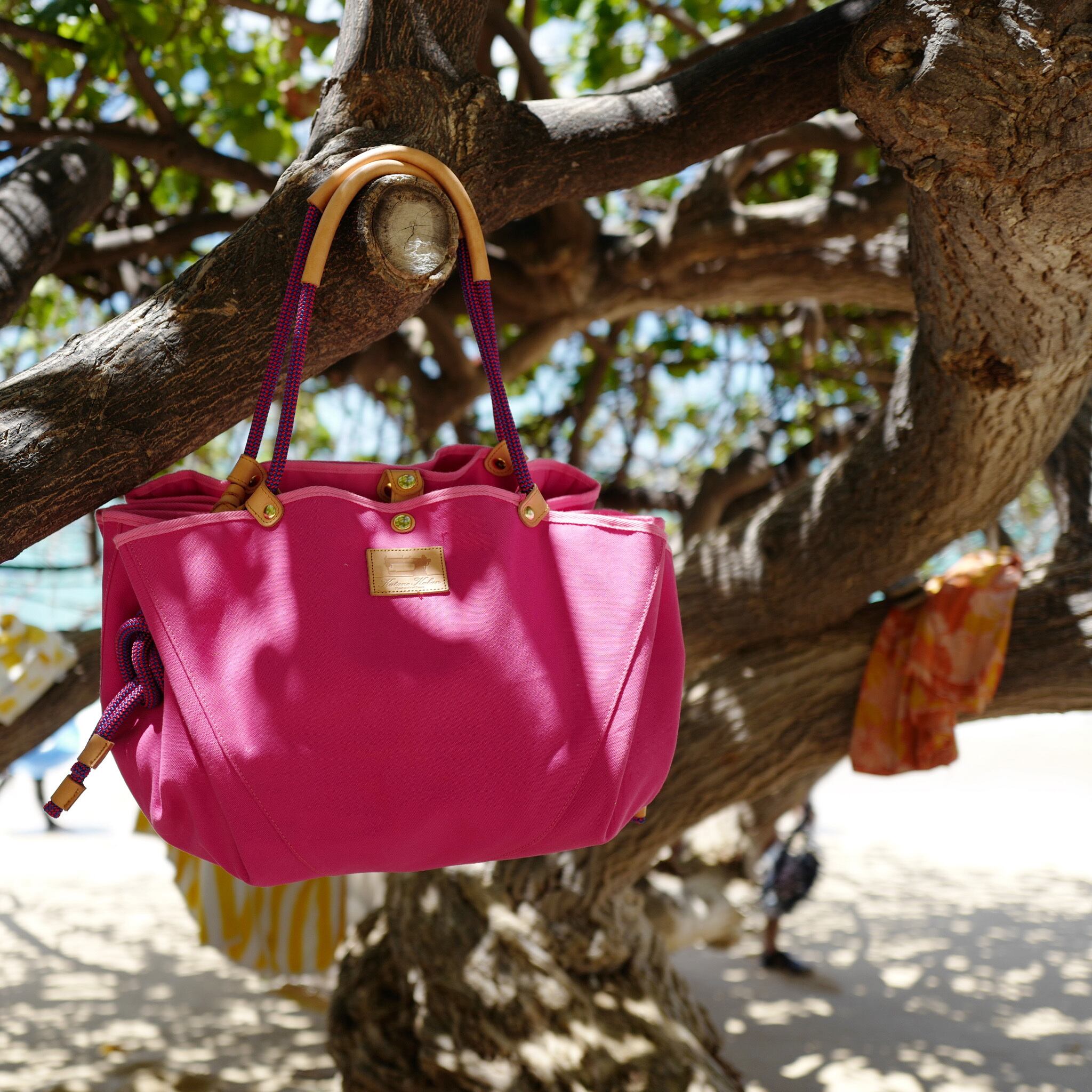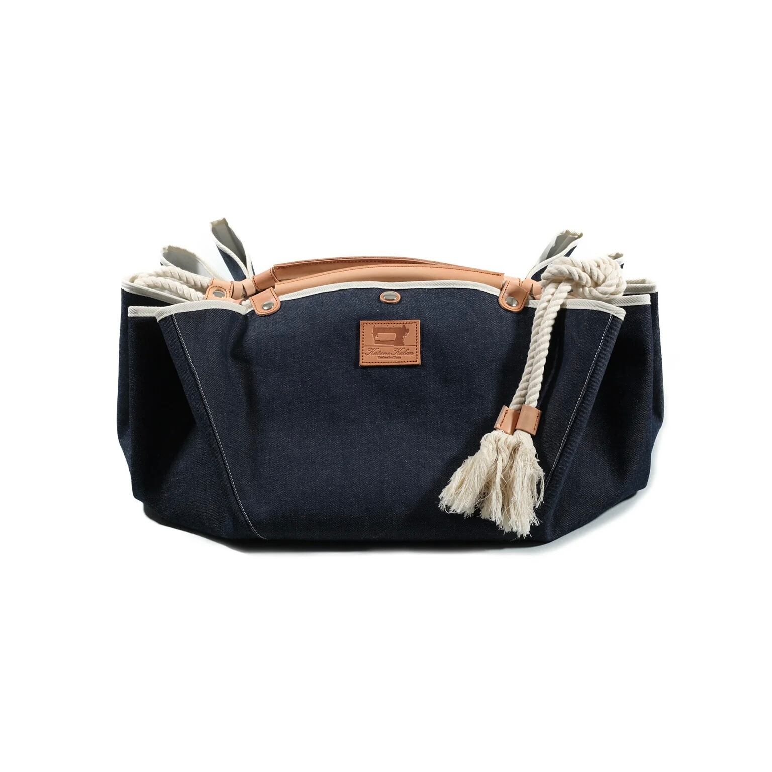 MATERIAL : 表地 – 綿100%、裏地 – ナイロン100%防水加工、テープ – アクリル100%、持ち手 – 牛ヌメ革、ロープ – ナイロン100%