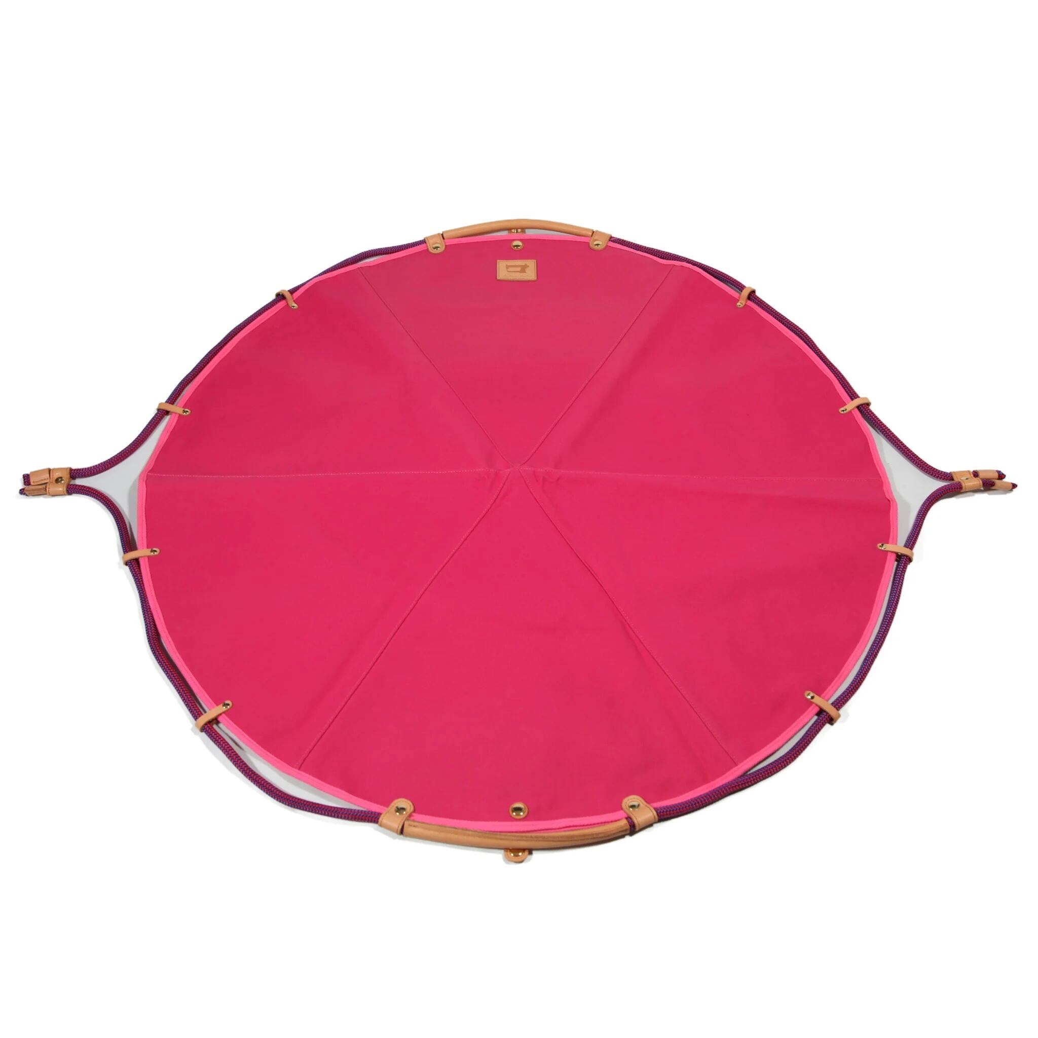 ひもをゆるめれば大きな円形マットとして展開、ロープを引けば立体的なバッグへ早変わり。